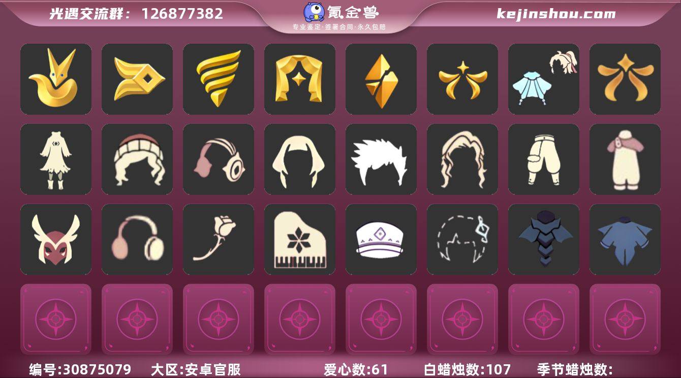 "亮点:6季白枭性价比多礼小号,彩虹武士裤,女巫裙,星月头冠,彩虹耳饰,彩虹耳机,圣诞鹿角,巫树犄角,彩虹帽,巫师帽,贝壳发饰,雪花发夹,玉兔发饰,小狗周年头饰,蓝色音乐会,创始人斗篷,星球夹克,欧若拉之翼,鲤跃龙门,蝙蝠斗,蛛网斗篷,暖冬瑞雪,白雪斗篷,绊爱礼包 区服:安卓官服 登录方式:邮箱 【毕业图】晨岛,云野,雨林,霞谷,暮土,禁阁 【毕业季】风行季,潜海季,表演季,小王子季,破晓季,欧若拉 【蜡烛】107【爱心】61【翼】188 【稀有礼包】彩虹武士裤,女巫裙,星月头冠,彩虹耳饰,彩虹耳机,圣诞鹿角,巫树犄角,彩虹帽,巫师帽,贝壳发饰,雪花发夹,玉兔发饰,小狗周年头饰,蓝色音乐会,创始人斗篷,星球夹克,欧若拉之翼,鲤跃龙门,蝙蝠斗,蛛网斗篷,暖冬瑞雪,白雪斗篷,绊爱礼包,夏日阳伞,情人秋千,花憩茶桌,冥龙南瓜,猫咪背饰,雪花水晶球,大橘大利,南瓜头,青衫落拓礼包,福娃礼包,年年有鱼礼包,皮皮猫套装 【毕业物品】多羽发饰,蓝黄羽袖,潜水面具,单边小辫,维京斗篷,帝企鹅发,黄眉企鹅面具,燕尾斗篷,双翼遥鲲斗,冥龙斗篷,留辫蘑菇头,高领舞服,透明蝶翼斗,小王子发型,小王子套装,玫瑰花 【热门复刻】武士裤,虚荣,正太头,猫猫头,背带裤,搓澡巾,花环长发,红耳机,箬笠,平顶帽,高音钢琴,白金斗篷,红金斗篷,黄鼠狼面具 【换绑cd】1.20"