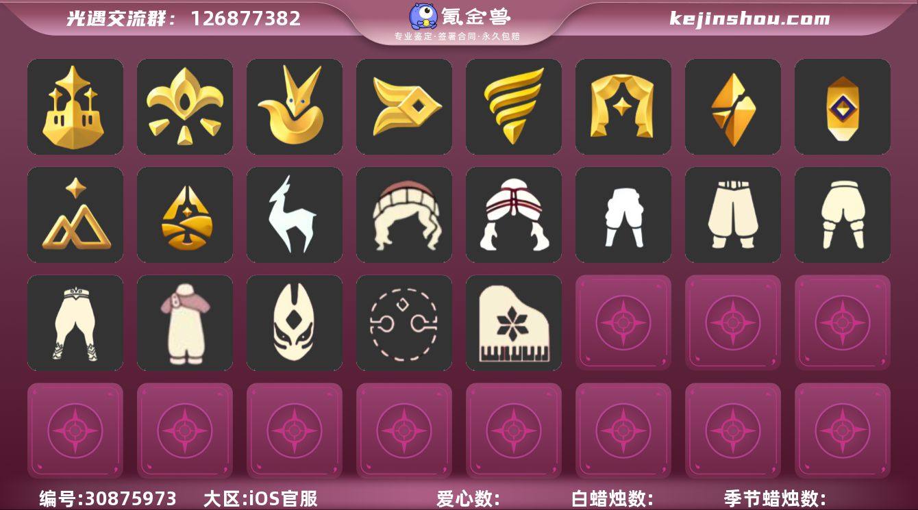 13季10翼白枭正太武士裤氧气面具妮妮长裙牛仔帽正太美工衣 资源:蜡烛87 爱心76 红烛40 翼10 已毕业地图:晨岛 雨林 霞谷 墓土 毕业季节:潜海季 表演季 追忆季 夜行季 拾光季 归巢季 九色鹿 筑巢季 二重奏 姆明季 彩染季 青鸟季 半欧若拉 毕业物品:单边小辫 暗红斗篷 氧气面具 黄眉企鹅面具 燕尾斗篷 白枭发型 肩带 追忆之书 棕熊面具 绒毛斗篷 粗框眼镜 季卡相机 西部帽 五塑彩羽发 五塑彩带斗 九色鹿丸子头 九色鹿丝带裤 九色鹿飞天斗篷 设计师长袍 光之子试衣 合奏挂画 蓝色燕尾服 白色高脚钢琴 姆明大伞 姆明抱枕 姆明长裙 彩染围巾斗篷 辉光羚羊面具 青鸟面饰 青鸟斗篷 稀有礼包:大桔大利 雪花发饰 贝壳发饰 玉兔发饰 金磷耳坠 彩虹耳钉 冥龙南瓜 热门裤子:背带裤 绑带舞服 奔月长裙 妮妮长裙 海洋阔腿裤 白棉裤 紧身连体衣 武士裤 小丑服 女仆围裙 美工衣 流珠红色连 燕尾探险礼 热门面具:矮人面具 狐狸面具 黄鼠狼面具 红兔面具 潜海面具 黄眉面具 一字眉 棕熊面具 盲僧面罩 向导面具 青鸟面具 玫瑰花面具 玫瑰面具 黑脸 黑框眼镜 鸟羽面具 热门发型:海草头 爆炸头 大胡子 雨妈 卡卡 平菇 龙骨 箬笠 蝴蝶结 公主头 粗辫 水母头 书虫 总裁头 正太头 高马尾 明制帽 郡主头 斗笠 虚荣 白枭 圆环发辫 留辫蘑菇头 彩色脏辫彩羽发型 兔子头 樱花头 猫头 女巫发型 圣诞帽 光头 热门头饰:尖角牛仔帽 牛仔帽 鸟羽发饰 花环 桔子发饰 珊瑚发饰 雪花发饰 贝壳发饰 玉兔发饰 红耳机 单边发饰 探险耳机 金磷耳坠 彩虹耳钉 热门斗篷:五星斗篷 花瓣斗篷 红金斗篷 黑金斗篷 白金斗篷 蝴蝶斗篷 汉服斗篷 燕尾服斗篷 展翼圆环斗 小浣熊斗篷 毛绒斗篷 布丁斗篷 布条斗篷 彩霞斗篷 灰色斗篷 双排扣斗篷 史力奇斗篷 姆明斗篷 镂空三条斗篷 镂空斗篷 彩染季围巾斗篷 红...