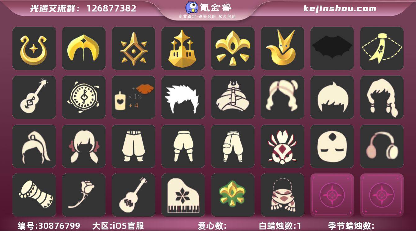 【lyg29】区服:国服ios'登入方式:手机'蜡烛数量:7734爱心:1742当前身高4.307最高身高2.383最矮身高14.383已经毕业地图:晨岛,云野,雨林,霞谷,暮土,禁阁'已经毕业季节:青鸟季,彩染季,姆明季,二重奏季,筑巢季,九色鹿季,归巢季,拾光季,夜行季,追忆季,欧若拉季,破晓季,表演季,潜海季,风行季,王子季,集结季,梦想季,预言季'稀有礼包:疯女巫长裙,奔离远行服饰,献给爱的裙装,祥云瑞气服饰,园丁装扮,彩虹武士裤,龙鳞束身长袍,向日葵连衣裙,月华霓裳,跃动跑鞋,夏日凉鞋,星月头冠,神鹿祝福头饰,彩虹耳饰,彩虹耳机,金鳞耳坠,满月耳坠,巫术犄角,圣诞鹿角,优雅领结,水母肩饰,姆明饰品套装,温暖绒帽,鲤鱼龙门,多彩绒绒帽,蛛网朋克,巫师帽,南瓜头,绊爱套装,海蓝波浪发型,贝壳,雪花发卡,玉兔,大桔大利,年年有余,四叶草头饰,夏日有友,tgc,创始人礼包,小王子围巾,星球夹克,AURORA 之翼,臣服斗篷,新春福娃,海龟斗篷,蜘蛛斗篷,蝙蝠斗篷,保暖雪人斗篷,白雪斗篷,暖冬瑞雪,粽子,蛛丝斗篷,异彩莲花斗篷,盘龙围巾斗篷,浪漫流星斗篷,衔福献瑞礼包,青衫落拓礼包'音韵吉他,欧若拉之声,惊喜手杖,灯笼,祥云瑞气纸伞,凯旋提琴,献瑞折扇礼包,狐狸背包,情人秋千,情人跷跷板,情人小船,花憩茶几,茶桌,野餐礼包,皮皮猫,冥龙南瓜,冰雪水晶球,篝火点心,球赛礼包,自然之声,夏日冲浪,中国绊爱大铁头,周年庆抱枕,古典音乐桌椅'热门物品:阿努比斯,蝴蝶结,公主头,正太头,樱花头,猫猫头,搓澡巾,武士裤,白棉裤,背带裤,花环头饰,宴会围巾,虚荣发型,红耳机,黄鼠狼面具,红狐狸面具,花瓣斗篷,灯泡斗篷,红金斗篷,白金斗篷,白鸟斗篷,吉他,尤克里里,高音钢琴,笛子,排箫,铃铛,雨伞