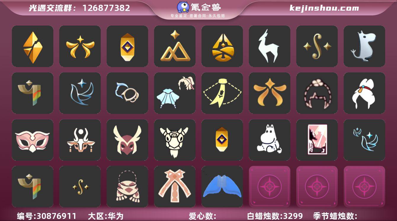 账号类型: 手机账号 季节已毕业: 潜海季,表演季,破晓季,欧若拉季,夜行季,追忆季,二重奏季,姆明季,彩染季,青鸟季,双星季 完成地图: 晨岛,云野,雨林,霞谷,暮土,禁阁 珍稀物品: 白枭,透明蝶翼斗 礼包: 蝙蝠套,巫师,围巾,星球斗,小狐狸,欧若拉之翼,九色鹿角,莲花斗,音乐桌,大耳狗抱枕,大耳狗装扮,绊爱,鹿角,荷叶伞,蜘蛛斗,牛仔裤,运动鞋,秋千,茶壶,白绒金,瑞雪,女巫裙,福娃,吉他,风之旅人,人声乐器,奔跑发型,雪花球,橘子,贝壳,红伞,兔子,南瓜,枯角,雪花,水母,猫套,猫背饰,星月头饰,彩虹耳钉,彩虹耳机,新年裤,蝴蝶结,四叶草,小提琴,透明蛛丝,创始人,海蓝波浪发型,姆明饰品套装,仙境茶会门扉礼包,爱丽丝围裙套装礼包,献瑞折扇礼包,心心相印发饰礼包,青衫落拓礼包,周年影院套餐礼包,活力海牛礼包 裤子: 武士裤,背带裤,搓澡巾,击剑裤,妮妮裙子,蓝绿裤,青鸟尊贵蓬头裤子 面具: 呼吸面具,夜行毕业面具,黄眉企鹅面具,辉光羚羊面具 面饰: 红耳机,青鸟毕业面饰 项链: 围巾 发型: 归巢毕业发型,若笠,虚荣,单侧绑发,留辫蘑菇头,海蓝波浪发型 头饰: 蓝色音乐会,平顶帽 斗篷: 海洋斗,绿芽,粉红绒毛斗篷,遥鲲斗篷,燕尾斗篷,冥龙斗篷,彩染围巾斗篷,玫瑰褶边斗篷,青鸟毕业斗篷 配饰: 雨伞,高音钢琴,姆明抱枕,小红伞,二重奏挂画,鲲灯 亮点: 【优质装备】:表演季,白枭(帝企鹅发),武士裤,潜海季,破晓季,透明蝶翼斗,欧若拉季(欧若拉),归巢毕业发型(五塑彩羽发),高音钢琴(白色高脚钢琴),夜行季,追忆季,妮妮裙子(妮妮长裙),姆明抱枕,小红伞(姆明红伞)(姆明大伞),蓝绿裤(高领舞服),围巾(肩带),蝙蝠套(蝙蝠斗篷)(南瓜头),星球斗(星球夹克),欧若拉之翼,福娃(福娃礼包)(春之日礼包)(铜钱斗),风之旅人(风之旅人礼包),莲花斗(异彩莲花斗篷),音乐桌(网易云留声机),绊爱(绊爱斗篷)(绊爱礼包),秋千(情人秋千),茶壶(小憩茶桌),红耳机,围巾(小王子斗篷)(...