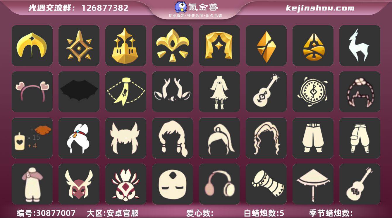 编号S001 vivo服 可直接换绑 详情请看衣柜截图 蜡烛数:973 爱心数:77 季节已毕业:风行季 潜海季 表演季 破晓季 欧若拉季 追忆季 夜行季 拾光季 归巢季 九色鹿季 筑巢季 二重奏季 姆明季 彩染季 青鸟季 双星季 迁徙有卡正常 风行-双星不断 珍稀物品:白枭 透明蝶翼斗 完成地图:霞谷 礼包:福娃 绊爱 橘子 贝壳 兔子 四叶草 彩虹耳钉 青衫落拓礼包 茶桌 南瓜 裤子:背带裤 遥鲲裙 白色背心裤子 绿丝裤 乞丐裤 古风裤 小布裙 姆明季·裤子 妮妮裙子 彩染挑衅艺伎裤子 青鸟伐木不舍裤子 海浪长裤 五周年裤子 遥鲲沙滩短裤 蛇年裤子 万圣裤 毛靴裤 搓澡巾 武士裤 灯笼裤 紧身裤 连体裤 雪人裤 击剑裤 飞天裤 工装裤 渔夫套装裤子 杂技裤 猫猫裤 小丑裤 小绿裤 猎手长袍 青鸟盛装裙子 鞋子:长筒凉鞋 毛靴 布鞋 皮鞋 凉鞋 人字拖 鱼嘴凉鞋 姆明季·鞋子 彩染挑衅艺伎鞋子 彩染跳跃舞者鞋子 万圣鞋 青鸟伐木不舍鞋子 寻宝长靴 盘扣平底鞋 面具:矮人面具 黄鼠 老头面具 蜘蛛面具 黑脸 九色鹿面具 星绘面具 咬花面具 狼人面具 蛇头面具 面饰:蒙眼面巾 黑框眼镜 青鸟毕业面饰 青鸟占卜智慧面饰 星星眼镜 麦穗 迁徙眼镜 蔚蓝眼镜 发型:公主 粗辫 书虫 总裁发型 正太 高马尾 明制 若笠 花环 斜刘海发型 虚荣 军帽 白枭 冥龙长辫 遥鲲长辫 爱神发型 水母头 失孤发型 小湫湫 逍遥发型 樱花 丸子头 猫耳 女巫 匠帽绅士发型 兔耳发型 头饰:风行毕业耳饰 草帽 蝴蝶结 黄色蝴蝶 爱心帽 贝雷帽 太阳帽 小黄帽 红耳机 斗篷:白斗 菱形斗篷 白金 红金 白鸟斗 蝴蝶斗篷 黄色蓑衣 花色斗篷 三色斗篷 双色放款斗篷 半边围巾斗篷 透明蝶翼斗 小熊猫分体斗篷 姆明季·斗篷 樱花斗 海洋斗 花瓣斗 绿芽 海洋斗 彩虹斗 蓝浴巾 黄浴巾 粉浴巾 万圣斗 圣诞斗 配饰:手持小铃铛 大铃铛乐器 笛子 尤克里里 贝斯乐器 高音钢琴 大提琴...