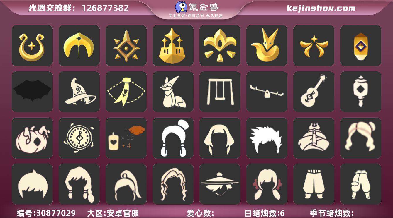 【编号Z7898】 蜡烛数量:581 爱心:99 翼数量:165 账号类型: 手机账号 季节已毕业: 预言季,梦想季,小王子季,风行季,潜海季,表演季,破晓季,欧若拉季,集结季,夜行季,追忆季,拾光季,归巢季,九色鹿季,筑巢季,二重奏季,姆明季,彩染季,青鸟季 完成地图: 晨岛,云野,雨林,霞谷,墓土,禁阁,全图毕业 珍稀物品: 阿努比斯(狗头),白枭,透明蝶翼斗,玫瑰花 礼包: 蝙蝠套,巫师,围巾,星球斗,小狐狸,欧若拉之翼,九色鹿角,莲花斗,大耳狗装扮,绊爱,大铁头,鹿角,荷叶伞,牛仔裤,兔子鞋,运动鞋,白绒金,福娃,灯笼,风之旅人,人声乐器,奔跑发型,鲤鱼套,雪花球,橘子,粽叶,贝壳,黄伞,红伞,兔子,南瓜,雪花,鲤鱼,水母,猫背饰,星月头饰,彩虹耳钉,彩虹耳机,新年裤,蝴蝶结,魔法棒,奥利奥,四叶草,暗彩装扮,向日葵套,拖鞋,爱心眼镜,透明蛛丝,浪漫流星斗,飞鸟纸伞,满月耳坠,姆明饰品套装,献瑞折扇礼包,渐变双马尾发型礼包,心心相印发饰礼包,粽子发饰礼包,青衫落拓礼包,冥龙南瓜 裤子: 武士裤,背带裤,白棉裤,搓澡巾 面具: 黄鼠狼,红狐狸,阿努比斯 面饰: 红耳机 项链: 围巾 发型: 蝴蝶结,正太,樱花,公主头,虚荣,猫耳 头饰: 花环 斗篷: 白金,红金,白鸟斗,花瓣斗篷,荧蓝斗篷 配饰: 雨伞,排箫,高音钢琴,吉他,笛子,大铃铛乐器,乐器 亮点: 重塑药水97,有青鸟季季卡