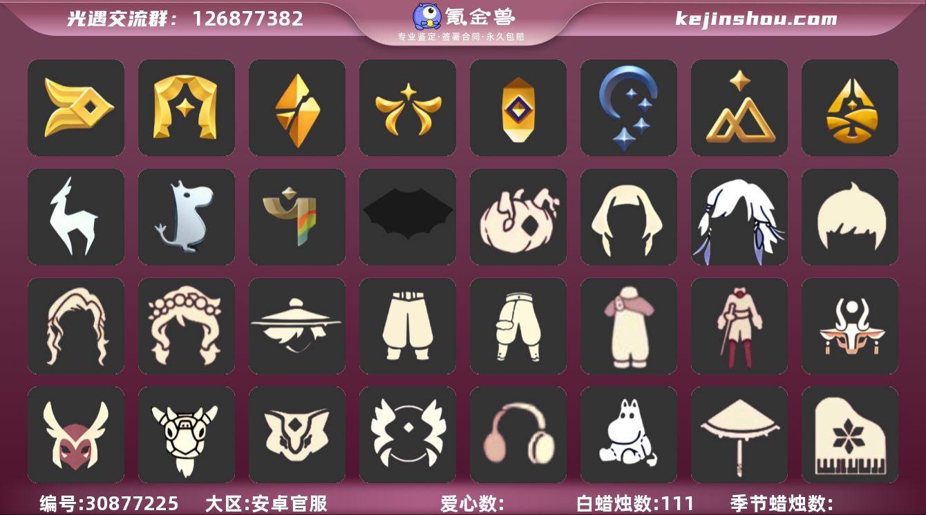 安卓官服 手机账号 3珍稀物品 11毕业季 6毕业图 999蜡烛 【珍稀物品】:白枭(帝企鹅发),玫瑰花,透明蝶翼斗 【季节已毕业】:青鸟季,小王子季(王子季),潜海季,表演季,破晓季,欧若拉季(欧若拉),夜行季,拾光季,九色鹿(九色鹿季),二重奏季,彩染季 【完成地图】:晨岛,云野,雨林,霞谷,墓土(暮土),禁阁 【礼包】:青衫落拓礼包,新年裤(瑞气服饰),蝴蝶结(大蝴蝶结),姆明饰品套装(姆明尾巴),海蓝波浪发型(海洋发型),彩虹帽(多彩绒帽),巫师(巫师帽),大耳狗装扮,绊爱(绊爱斗篷)(绊爱礼包),锦标赛桂冠,雪花(雪花发夹),兔子(玉兔头饰)(玉兔发饰)(兔子发饰),四叶草(四叶草头饰),星月头饰(星月头冠),九色鹿角(神鹿祝福头饰)(神鹿祝福礼包),彩虹耳钉(彩虹耳饰),彩虹耳机,创始人(创始人斗篷),福娃(福娃礼包)(春之日礼包)(铜钱斗),蝙蝠套(蝙蝠斗篷)(南瓜头),蜘蛛斗(蛛丝斗篷)(蛛网斗篷),白绒金(白雪斗篷),吉他(音韵吉他)(白吉他),人声乐器(欧若拉之声),小狐狸(狐狸背包) 【裤子】:筑巢季·裤子(设计师长袍),青鸟尊贵蓬头裤子(蓝色燕尾服),飞天裤(柔缎花边连)(九色鹿丝带裤),王子服(小王子套装),蓝绿裤(高领舞服),武士裤,背带裤,搓澡巾,击剑裤 【面具】:夜行毕业面具(棕熊面具),呼吸面具(潜水面具),贴花面具(丛林黑面具),黄眉企鹅面具,辉光羚羊面具,凤凰面具 【面饰】:黑框眼镜(粗框眼镜),青鸟毕业面饰(青鸟面饰),红耳机 【发型】:小王子发型,单侧绑发(单边小辫),海蓝波浪发型,飞天盘发(九色鹿丸子头),留辫蘑菇头,虚荣,若笠(箬笠) 【头饰】:平顶帽,蓝色音乐会(蓝色音乐符),牛仔帽(西部帽) 【斗篷】:燕尾斗篷,遥鲲斗篷(双翼遥鲲斗),粉红绒毛斗篷(绒毛斗篷),冥龙斗篷,青鸟毕业斗篷(青鸟斗篷),彩染围巾斗篷,绿芽,海洋斗 【配饰】:相机(季卡相机),玫瑰花,二重奏挂画(合奏挂画),雨伞,高音钢琴(白色高脚钢琴)