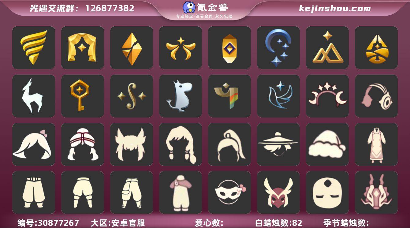 账号类型: 手机账号 季节已毕业: 圣岛季,预言季,梦想季,小王子季,风行季,潜海季,表演季,破晓季,欧若拉季,集结季,夜行季,追忆季,拾光季,归巢季,九色鹿季,筑巢季,二重奏季,姆明季,彩染季,青鸟季,双星季 完成地图: 晨岛,云野,雨林,霞谷,暮土,禁阁 珍稀物品: 鳐鲲斗篷,阿努比斯(狗头),白枭,透明蝶翼斗,玫瑰花,彩虹围巾 礼包: 蝙蝠套,巫师,围巾,星球斗,小狐狸,九色鹿角,大耳狗抱枕,大耳狗装扮,绊爱,大铁头,鹿角,荷叶伞,蜘蛛斗,兔子鞋,大耳狗发饰,运动鞋,秋千,茶桌,茶壶,餐桌,白绒金,瑞雪,福娃,灯笼,风之旅人,彩虹帽,雪花球,橘子,兔子,南瓜,枯角,雪花,猫背饰,星月头饰,彩虹耳钉,蝴蝶结,奥利奥,四叶草,透明蛛丝,创始人,飞鸟纸伞,向日葵连衣裙,海龟斗篷,园丁装扮,献瑞折扇礼包,小狗周年发饰,风之旅人白袍,青衫落拓礼包 裤子: 武士裤,背带裤,搓澡巾,击剑裤,妮妮裙子,王子服,蓝绿裤,飞天裤,筑巢季·裤子,青鸟尊贵蓬头裤子 面具: 阿努比斯,凤凰面具,贴花面具,呼吸面具,夜行毕业面具,黄眉企鹅面具,辉光羚羊面具 面饰: 红耳机,黑框眼镜,青鸟毕业面饰 项链: 围巾 发型: 归巢毕业发型,若笠,虚荣,单侧绑发,小王子发型,留辫蘑菇头,飞天盘发 头饰: 行军锅头盔,羽毛发饰,牛仔帽,蓝色音乐会,平顶帽 斗篷: 海洋斗,蟑螂斗,绿芽,粉红绒毛斗篷,遥鲲斗篷,黄色连帽披风,燕尾斗篷,冥龙斗篷,彩染围巾斗篷,青鸟毕业斗篷 配饰: 雨伞,筑巢季·小手办,高音钢琴,姆明抱枕,小红伞,相机,玫瑰花,二重奏挂画,圆鼓,蓝色手碟,鲲灯 亮点: 【优质装备】:预言季,阿努比斯(狗头),表演季,白枭(帝企鹅发),武士裤,圣岛季,梦想季,小王子季(王子季),风行季,潜海季,破晓季,鳐鲲斗篷,透明蝶翼斗,欧若拉季(欧若拉),归巢毕业发型(五塑彩羽发),行军锅头盔(六边锅帽子)(双耳锅帽子),羽毛发饰(多羽发饰),筑巢季·小手办(光之子试衣),高音钢琴(白色高脚钢琴),集结季,玫瑰花,...