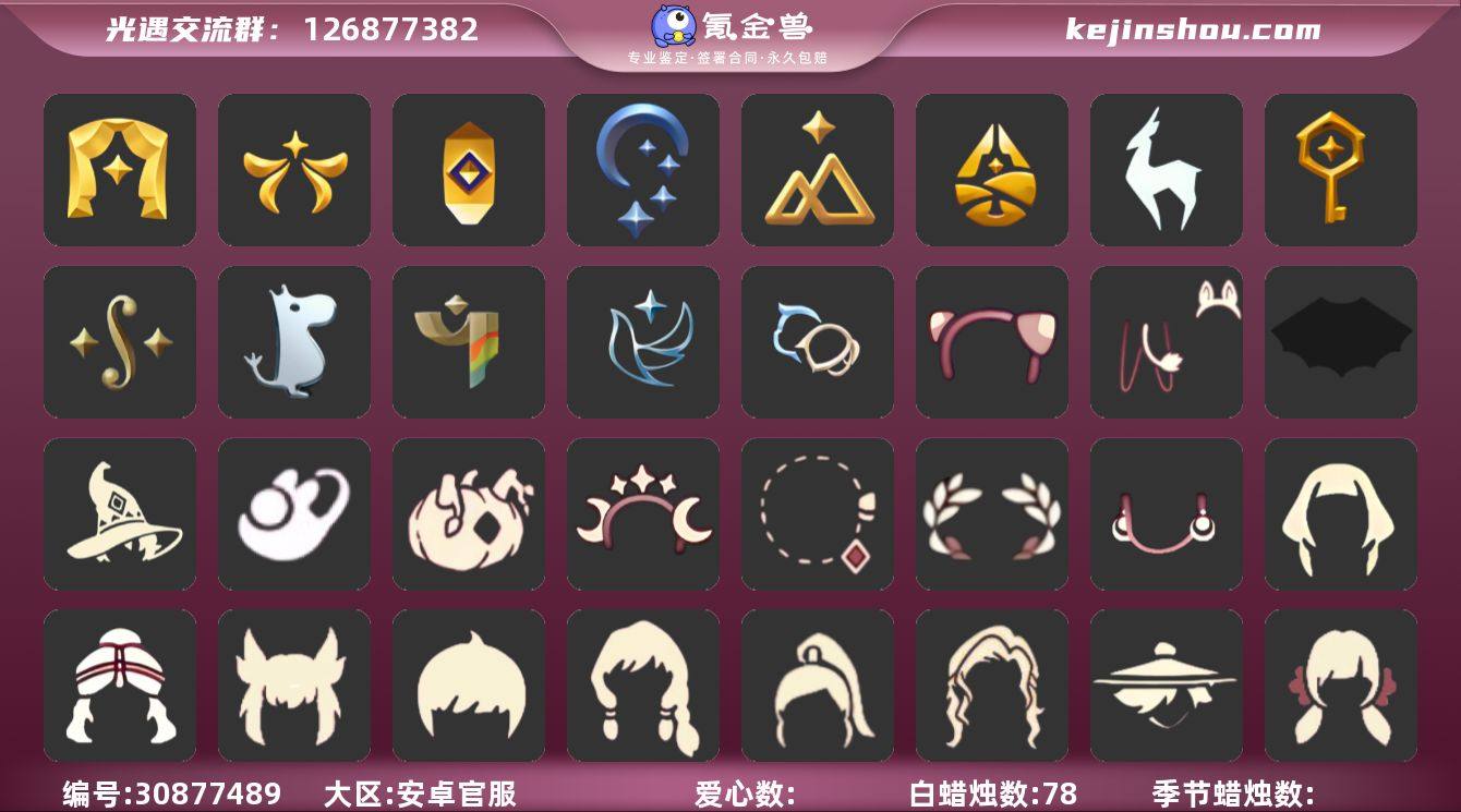 账号类型: 手机账号 季节已毕业: 圣岛季,预言季,梦想季,小王子季,风行季,潜海季,表演季,破晓季,欧若拉季,集结季,夜行季,追忆季,拾光季,归巢季,九色鹿季,筑巢季,二重奏季,彩染季,青鸟季,双星季 完成地图: 晨岛,云野,雨林,霞谷,暮土,禁阁 珍稀物品: 鳐鲲斗篷,阿努比斯(狗头),白枭,透明蝶翼斗,玫瑰花,彩虹围巾 礼包: 蝙蝠套,巫师,围巾,星球斗,小狐狸,绊爱,大铁头,鹿角,蜘蛛斗,秋千,茶桌,茶壶,白绒金,瑞雪,女巫裙,福娃,跷跷板,小船,吉他,灯笼,彩虹帽,雪花球,绒帽,橘子,贝壳,黄伞,红伞,兔子,南瓜,枯角,雪花,水母,彩虹耳钉,新年耳钉,创始人,满月耳坠,献瑞折扇礼包,青衫落拓礼包 裤子: 武士裤,背带裤,搓澡巾,击剑裤,王子服,蓝绿裤,筑巢季·裤子,风行毕业裤子 面具: 阿努比斯,凤凰面具,呼吸面具,夜行毕业面具,黄眉企鹅面具,辉光羚羊面具 面饰: 红耳机,黑框眼镜,青鸟毕业面饰 项链: 围巾 发型: 归巢毕业发型,若笠,虚荣,单侧绑发,小王子发型,留辫蘑菇头,飞天盘发 头饰: 行军锅头盔,羽毛发饰,牛仔帽,蓝色音乐会,平顶帽 斗篷: 海洋斗,蟑螂斗,粉红绒毛斗篷,遥鲲斗篷,黄色连帽披风,燕尾斗篷,冥龙斗篷,领主红斗篷,瑞雪斗篷,彩染围巾斗篷,青鸟毕业斗篷 配饰: 雨伞,筑巢季·小手办,高音钢琴,相机,玫瑰花,圆鼓,蓝色手碟,鲲灯 亮点: 【优质装备】:预言季,阿努比斯(狗头),表演季,白枭(帝企鹅发),武士裤,圣岛季,梦想季,小王子季(王子季),风行季,潜海季,破晓季,鳐鲲斗篷,透明蝶翼斗,欧若拉季(欧若拉),归巢毕业发型(五塑彩羽发),行军锅头盔(六边锅帽子)(双耳锅帽子),羽毛发饰(多羽发饰),筑巢季·小手办(光之子试衣),高音钢琴(白色高脚钢琴),集结季,玫瑰花,夜行季,追忆季,牛仔帽(西部帽),相机(季卡相机),拾光季,彩虹围巾(五塑彩带斗),归巢季,九色鹿(九色鹿季),王子服(小王子套装),蓝绿裤(高领舞服),蟑螂斗(凤凰斗篷),围巾(肩带),筑巢季,蝙蝠...