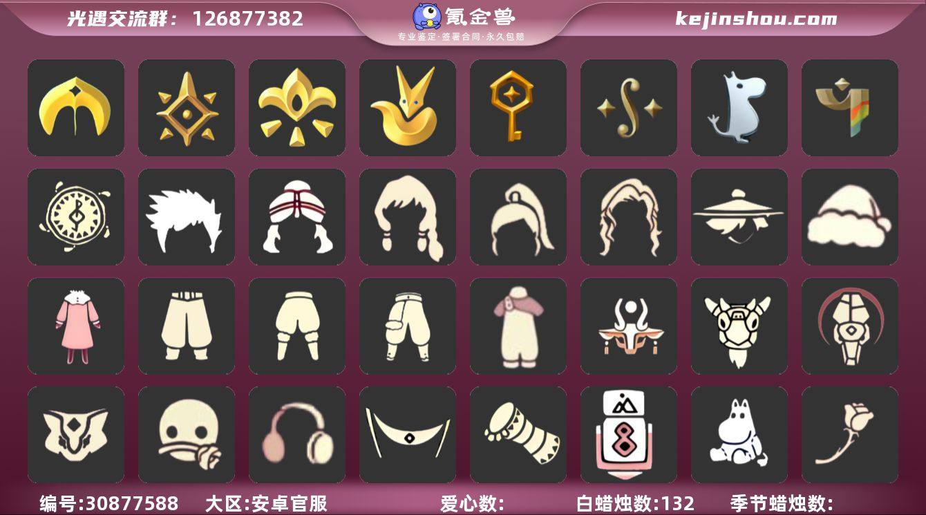 账号类型: 手机账号 季节已毕业: 圣岛季,梦想季,小王子季,风行季,潜海季,表演季,破晓季,欧若拉季,集结季,夜行季,追忆季,拾光季,归巢季,九色鹿季,筑巢季,彩染季 完成地图: 全图毕业 礼包: 蝙蝠套,巫师,围巾,星球斗,小狐狸,欧若拉之翼,九色鹿角,莲花斗,音乐桌,绊爱,大铁头,鹿角,荷叶伞,蜘蛛斗,牛仔裤,兔子鞋,肯德基联动,运动鞋,秋千,茶桌,白绒金,瑞雪,福娃,小船,灯笼,奔跑裤子,致爱装扮,人声乐器,奔跑发型,鲤鱼套,彩虹帽,雪花球,橘子,粽叶,贝壳,红伞,兔子,南瓜,枯角,雪花,tgc,猫套,猫背饰,星月头饰,彩虹耳钉,彩虹耳机,雪怪斗,新年裤,蝴蝶结,魔法棒,奥利奥,海螺,四叶草,暗彩装扮,向日葵套,小提琴,拖鞋,滑板,伯爵斗篷,透明蛛丝,飞蛾套,雪人鞋,新年耳钉,龙纹斗,浪漫流星斗,创始人,海蓝波浪发型,满月耳坠,锦标赛桂冠,线框斗,姆明饰品套装,史力奇套装,史力奇帽子,树精肩饰,恶作剧鸦羽斗篷,向日葵连衣裙,龙鳞束身长袍,妮妮斗篷,园丁装扮,衔福献瑞礼包,献瑞折扇礼包,渐变双马尾发型礼包,心心相印发饰礼包,小狗周年发饰,奉献斗篷,风之旅人白袍,粽子发饰礼包,必胜客联动分享披萨背饰礼包,青衫落拓礼包,周年影院套餐礼包,缤纷飘带斗篷礼包,小黄鸭雨衣套装礼包,小黄鸭发饰礼包,蝴蝶与花发饰礼包,暗陨斗篷礼包,小海牛配饰礼包,海牛玩偶礼包,活力海牛礼包,冥龙套装礼包,周年燕尾服斗篷,周年礼包