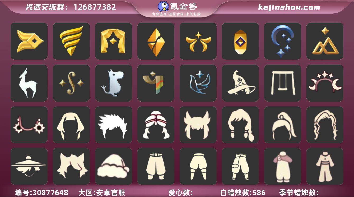 10季11翼潜海面具鲲灯巫树犄角白枭白雪斗篷周年抱枕明制帽黄鼠狼面具 资源: 蜡烛 4840 爱心128 红烛36 翼11 已毕业地图:全图毕业 毕业季节: 潜海季 表演季 欧若拉季 追忆季 夜行季 拾光季 归巢季 九色鹿季 彩染季 青鸟季 稀有礼包:橘子发饰 彩虹耳机 巫术犄角 大桔大利 白雪斗篷 绊爱 祥云雨伞 周年抱枕 热门裤子:绑带舞服 奔月长袍 妮妮长裙 海洋武士裤 白棉裤 紧身连体衣 武士裤 小丑服 红色流珠裙 美工衣 探险燕尾服 暗彩武士裤 米色西装裤 热门面具:矮人面具 狐狸面具 黄鼠狼面具 氧气面具 黄眉面具 一字眉 棕熊面具 向导面具 龙头 玫瑰花面具 玫瑰面具 黑脸 粽叶面具 鸟羽面具 热门发型:海藻头 爆炸头 大胡子 小飞象 雨妈 卡卡 平菇 箬笠 蝴蝶结 公主头 粗辫 水母头 书虫 总裁头 正太头 高马尾 明制帽 郡主头 斗笠 绿丝带 虚荣 白枭 圆环发辫 留辫蘑菇头 李逍遥发型 彩色脏辫 彩羽发型 双辫发型 遥鲲发型 南瓜头 巫师帽 女巫发型 绊爱发型 光头 热门头饰:粗框眼睛 尖角牛仔帽 牛仔帽 飞羽方式 大橘大利 花环 珊瑚发饰 蓝色音乐会 红耳机 辫子发饰 九色鹿鹿角 彩虹耳机 巫术犄角 热门斗篷:五角星斗篷 花瓣斗篷 红金斗篷 黑金斗篷 白金斗篷 蝴蝶斗篷 汉服斗篷 燕尾斗篷 占医院换的 透明蝶翼 小浣熊斗篷 毛绒斗 布条斗篷 布丁斗篷 彩霞斗篷 国风斗篷 灰色斗篷 史力奇 斗篷 姆明季斗篷 镂空斗篷 镂空三条斗 彩染季围巾斗篷 红色探险斗 星空斗篷 鸟羽斗篷 樱花斗篷 马蹄莲斗篷 绿芽 海洋斗篷 漩涡 斗篷 水纹斗篷 暗彩斗篷 太阳光束斗篷 白雪斗篷 蝙蝠斗篷 绊爱斗篷 热门背饰:号角 季卡相机 进阶版相机 祥云雨伞 红色雨伞 椅子 吊床...