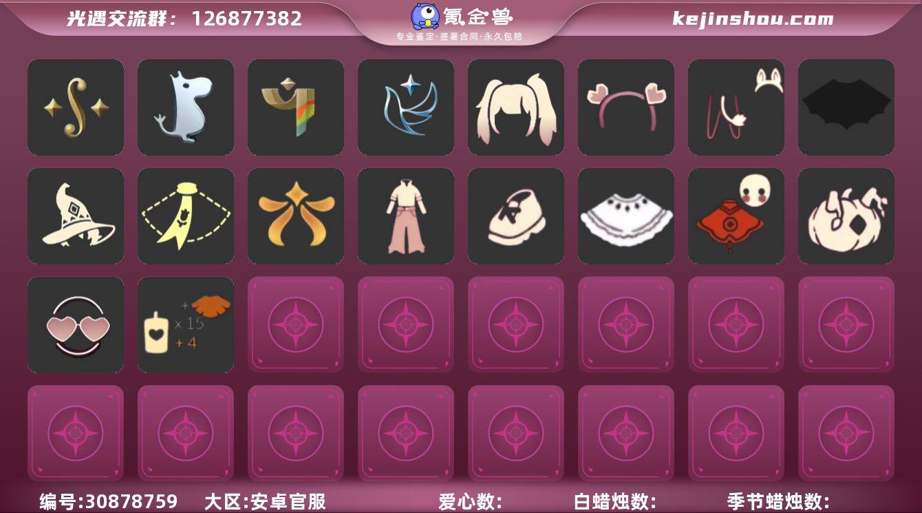 账号类型: 手机账号 季节已毕业: 潜海季,表演季,破晓季,欧若拉季,夜行季,追忆季,拾光季,归巢季,九色鹿季,筑巢季,二重奏季,姆明季,彩染季,青鸟季,迁徙季 完成地图: 晨岛,云野,雨林,霞谷,暮土,禁阁 珍稀物品: 白枭,透明蝶翼斗,彩虹围巾 礼包: 蝙蝠套,巫师,围巾,九色鹿角,绊爱,牛仔裤,运动鞋,茶桌,白绒金,瑞雪,人声乐器,奔跑发型,橘子,贝壳,兔子,南瓜,枯角,雪花,水母,星月头饰,蝴蝶结,奥利奥,四叶草,爱心眼镜,新年耳钉,海蓝波浪发型,满月耳坠,姆明饰品套装,海龟斗篷,献瑞折扇礼包,心心相印发饰礼包,小狗周年发饰,青衫落拓礼包,线框斗篷礼包 裤子: 武士裤,背带裤,搓澡巾,妮妮裙子,蓝绿裤,飞天裤,筑巢季·裤子,青鸟尊贵蓬头裤子 面具: 呼吸面具,夜行毕业面具,黄眉企鹅面具,辉光羚羊面具 面饰: 红耳机,黑框眼镜,青鸟毕业面饰 项链: 围巾 发型: 归巢毕业发型,若笠,虚荣,单侧绑发,留辫蘑菇头,飞天盘发,海蓝波浪发型 头饰: 牛仔帽,蓝色音乐会,平顶帽 斗篷: 海洋斗,绿芽,粉红绒毛斗篷,遥鲲斗篷,燕尾斗篷,冥龙斗篷,彩染围巾斗篷,青鸟毕业斗篷 配饰: 雨伞,筑巢季·小手办,高音钢琴,姆明抱枕,小红伞,相机,二重奏挂画,鲲灯 亮点: 【优质装备】:表演季,白枭(帝企鹅发),武士裤,潜海季,破晓季,透明蝶翼斗,欧若拉季(欧若拉),归巢毕业发型(五塑彩羽发),筑巢季·小手办(光之子试衣),高音钢琴(白色高脚钢琴),夜行季,追忆季,妮妮裙子(妮妮长裙),牛仔帽(西部帽),姆明抱枕,小红伞(姆明红伞)(姆明大伞),相机(季卡相机),拾光季,彩虹围巾(五塑彩带斗),归巢季,九色鹿(九色鹿季),蓝绿裤(高领舞服),飞天裤(柔缎花边连)(九色鹿丝带裤),围巾(肩带),筑巢季,蝙蝠套(蝙蝠斗篷)(南瓜头),绊爱(绊爱斗篷)(绊爱礼包),茶桌(花憩茶桌),红耳机,围巾(小王子斗篷)(小王子围巾),九色鹿角(神鹿祝福头饰)(神鹿祝福礼包),瑞雪(瑞雪斗篷)(暖冬瑞雪),人声乐器(欧若拉之声...