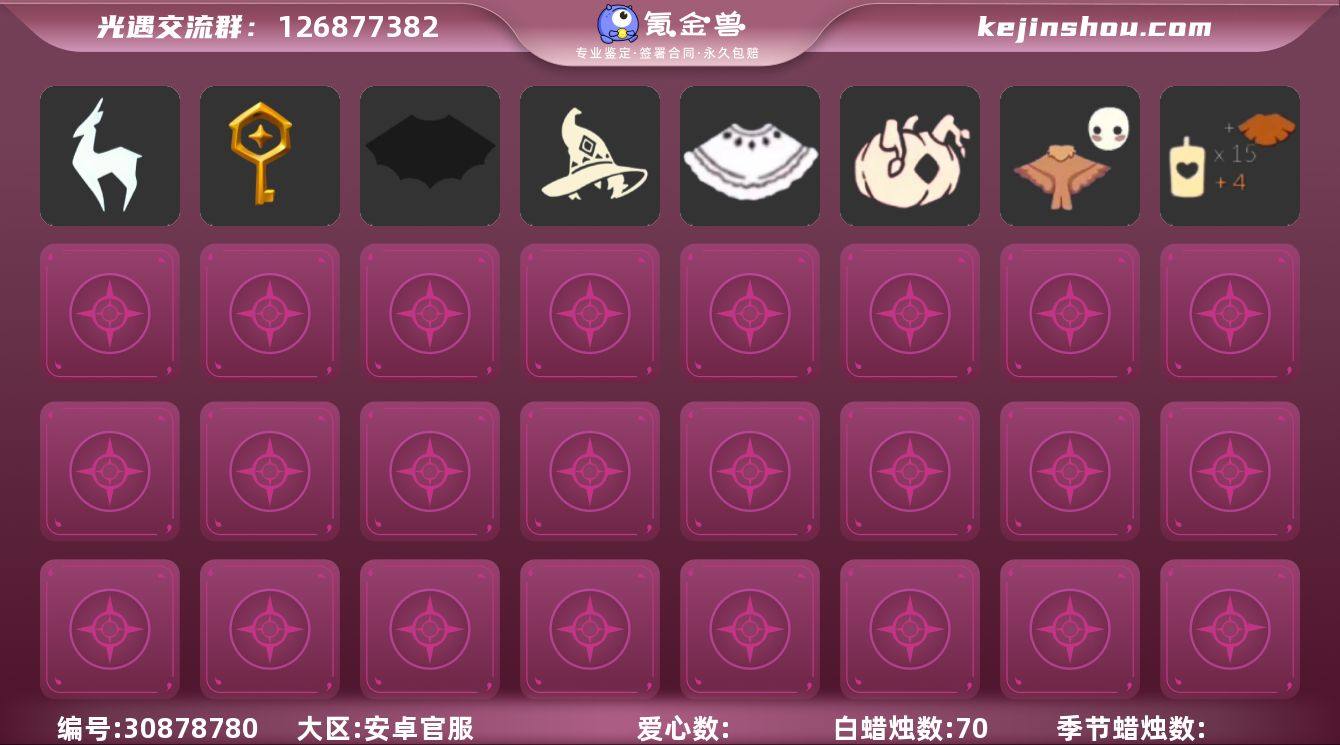 bc1324区服:国服安卓官服,登入方式:邮箱【2季卡】巫师帽蝙蝠斗白雪斗文雀装扮樱花头虚荣发型,蜡烛数量:70,爱心:9,当前身高1.532,最高身高0.978,最矮身高12.978,已经毕业地图:晨岛,雨林,霞谷,已经毕业季节:筑巢季,九色鹿季,稀有礼包:巫师帽,南瓜头,创始人礼包,蝙蝠斗篷,白雪斗篷,文雀装扮,热门物品:蝴蝶结,公主头,樱花头,花环头饰,宴会围巾,虚荣发型,红耳机,黄鼠狼面具,花瓣斗篷,灯泡斗篷,笛子