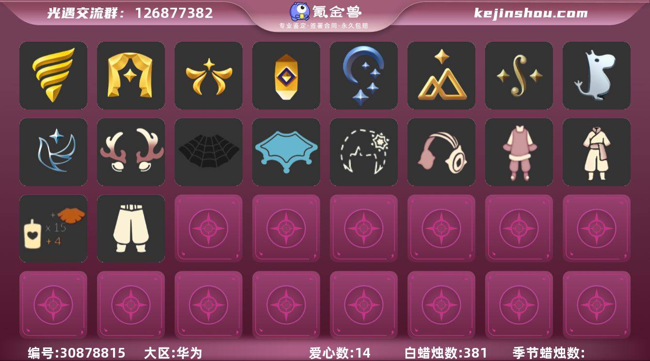 账号类型: 邮箱账号 季节已毕业: 表演季,破晓季,欧若拉季,夜行季,追忆季,拾光季,归巢季,九色鹿季,筑巢季,二重奏季,姆明季,彩染季,青鸟季,双星季,迁徙季 完成地图: 晨岛,云野,雨林,霞谷,暮土,禁阁 珍稀物品: 白枭,透明蝶翼斗,彩虹围巾 礼包: 巫师,围巾,兔子,新年裤,暗彩装扮 裤子: 武士裤,搓澡巾,妮妮裙子,蓝绿裤,飞天裤,筑巢季·裤子,青鸟尊贵蓬头裤子 面具: 夜行毕业面具,黄眉企鹅面具,辉光羚羊面具 面饰: 黑框眼镜,青鸟毕业面饰 项链: 围巾 发型: 归巢毕业发型,若笠,虚荣,留辫蘑菇头,飞天盘发 头饰: 牛仔帽,蓝色音乐会,平顶帽 斗篷: 海洋斗,绿芽,粉红绒毛斗篷,遥鲲斗篷,燕尾斗篷,冥龙斗篷,彩染围巾斗篷,青鸟毕业斗篷 配饰: 雨伞,筑巢季·小手办,高音钢琴,姆明抱枕,小红伞,相机,二重奏挂画,鲲灯 亮点: 【优质装备】:表演季,白枭(帝企鹅发),武士裤,青鸟尊贵蓬头裤子(蓝色燕尾服),破晓季,透明蝶翼斗,欧若拉季(欧若拉),归巢毕业发型(五塑彩羽发),筑巢季·小手办(光之子试衣),高音钢琴(白色高脚钢琴),夜行季,追忆季,妮妮裙子(妮妮长裙),牛仔帽(西部帽),姆明抱枕,小红伞(姆明红伞)(姆明大伞),相机(季卡相机),拾光季,彩虹围巾(五塑彩带斗),归巢季,九色鹿(九色鹿季),蓝绿裤(高领舞服),飞天裤(柔缎花边连)(九色鹿丝带裤),围巾(肩带),筑巢季,二重奏季,二重奏挂画(合奏挂画),姆明季,筑巢季·裤子(设计师长袍),夜行毕业面具(棕熊面具),黄眉企鹅面具,黑框眼镜(粗框眼镜),留辫蘑菇头,粉红绒毛斗篷(绒毛斗篷),遥鲲斗篷(双翼遥鲲斗),燕尾斗篷,冥龙斗篷,鲲灯(追忆之书),辉光羚羊面具,彩染季,飞天盘发(九色鹿丸子头),青鸟季,青鸟毕业面饰(青鸟面饰),青鸟毕业斗篷(青鸟斗篷),双星季,围巾(小王子斗篷)(小王子围巾),暗彩装扮(彩虹武士裤),巫师(巫师帽),新年裤(瑞气服饰),晨岛,云野,雨林,霞谷,墓土(暮土),禁阁,若笠(箬笠),兔子(玉兔头饰)(...