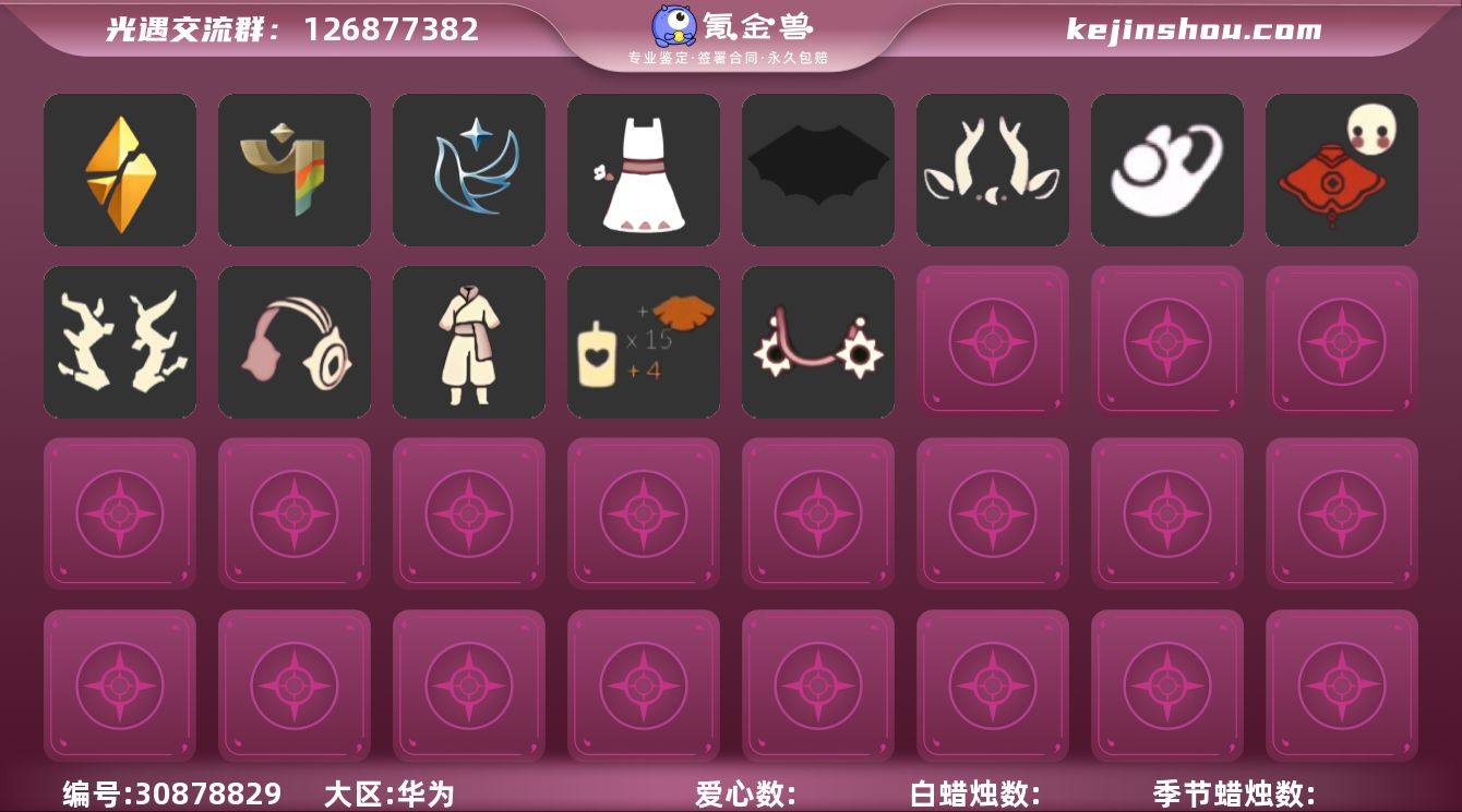 账号类型: 手机账号 季节已毕业: 圣岛季,预言季,梦想季,潜海季,破晓季,欧若拉季,夜行季,追忆季,二重奏季,姆明季,彩染季,青鸟季,双星季,迁徙季 完成地图: 晨岛,云野,雨林,霞谷,暮土,禁阁 珍稀物品: 鳐鲲斗篷,阿努比斯(狗头),透明蝶翼斗 礼包: 蝙蝠套,围巾,绊爱,兔子鞋,瑞雪,橘子,兔子,南瓜,星月头饰,新年裤,暗彩装扮,爱心眼镜,透明蛛丝,新年耳钉,创始人,日光耳环,云音伴游耳机 裤子: 武士裤,搓澡巾,击剑裤,妮妮裙子,王子服,蓝绿裤,青鸟尊贵蓬头裤子 面具: 阿努比斯,凤凰面具,呼吸面具,夜行毕业面具,黄眉企鹅面具,辉光羚羊面具 面饰: 红耳机,青鸟毕业面饰 项链: 围巾 发型: 若笠,虚荣,单侧绑发,小王子发型,留辫蘑菇头 头饰: 蓝色音乐会,平顶帽 斗篷: 海洋斗,蟑螂斗,粉红绒毛斗篷,遥鲲斗篷,冥龙斗篷,彩染围巾斗篷,青鸟毕业斗篷 配饰: 雨伞,高音钢琴,姆明抱枕,小红伞,二重奏挂画,圆鼓,蓝色手碟,鲲灯 亮点: 【优质装备】:预言季,阿努比斯(狗头),武士裤,青鸟尊贵蓬头裤子(蓝色燕尾服),圣岛季,梦想季,潜海季,破晓季,鳐鲲斗篷,透明蝶翼斗,欧若拉季(欧若拉),高音钢琴(白色高脚钢琴),夜行季,追忆季,妮妮裙子(妮妮长裙),姆明抱枕,小红伞(姆明红伞)(姆明大伞),王子服(小王子套装),蓝绿裤(高领舞服),蟑螂斗(凤凰斗篷),围巾(肩带),二重奏季,二重奏挂画(合奏挂画),姆明季,凤凰面具,呼吸面具(潜水面具),夜行毕业面具(棕熊面具),黄眉企鹅面具,单侧绑发(单边小辫),小王子发型,留辫蘑菇头,粉红绒毛斗篷(绒毛斗篷),遥鲲斗篷(双翼遥鲲斗),冥龙斗篷,圆鼓(手拍大鼓),蓝色手碟(毕业手碟),鲲灯(追忆之书),辉光羚羊面具,彩染季,青鸟季,青鸟毕业面饰(青鸟面饰),青鸟毕业斗篷(青鸟斗篷),双星季,蝙蝠套(蝙蝠斗篷)(南瓜头),绊爱(绊爱斗篷)(绊爱礼包),红耳机,围巾(小王子斗篷)(小王子围巾),瑞雪(瑞雪斗篷)(暖冬瑞雪),暗彩装扮(彩虹武士裤),透明...