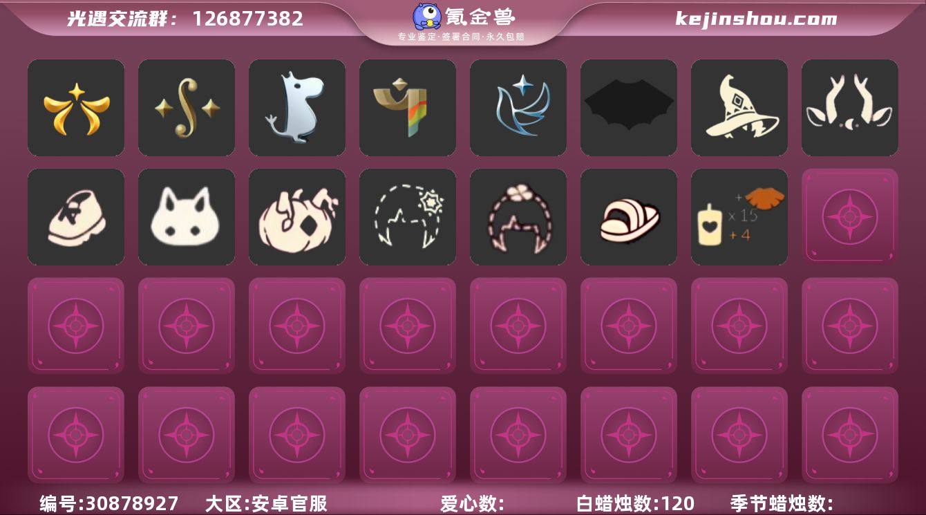 账号类型: 手机账号 季节已毕业: 表演季,破晓季,欧若拉季,追忆季,拾光季,归巢季,九色鹿季,筑巢季,二重奏季,姆明季,彩染季,青鸟季,双星季,迁徙季 完成地图: 晨岛,云野,雨林,霞谷,暮土,禁阁 珍稀物品: 白枭,透明蝶翼斗,彩虹围巾 礼包: 巫师,欧若拉之翼,九色鹿角,莲花斗,鹿角,荷叶伞,蜘蛛斗,兔子鞋,秋千,白绒金,福娃,小船,吉他,人声乐器,橘子,贝壳,兔子,枯角,水母,猫套,猫背饰,星月头饰,彩虹耳钉,彩虹耳机,四叶草,滑板,透明蛛丝,新年耳钉,彩虹泡泡机,蛛网朋克,龙鳞束身长袍,衔福献瑞礼包,献瑞折扇礼包,渐变双马尾发型礼包,心心相印发饰礼包,小狗周年发饰,奉献斗篷,青衫落拓礼包,周年影院套餐礼包 裤子: 武士裤,背带裤,搓澡巾,击剑裤,妮妮裙子,蓝绿裤,筑巢季·裤子 面具: 黄眉企鹅面具,辉光羚羊面具 面饰: 红耳机,黑框眼镜,青鸟毕业面饰 项链: 围巾 发型: 归巢毕业发型,若笠,虚荣,留辫蘑菇头,飞天盘发 头饰: 牛仔帽,蓝色音乐会,平顶帽 斗篷: 海洋斗,绿芽,遥鲲斗篷,燕尾斗篷,冥龙斗篷,彩染围巾斗篷,奉献斗篷,青鸟毕业斗篷 配饰: 雨伞,筑巢季·小手办,高音钢琴,姆明抱枕,相机,鲲灯 亮点: 【优质装备】:表演季,白枭(帝企鹅发),武士裤,破晓季,透明蝶翼斗,欧若拉季(欧若拉),归巢毕业发型(五塑彩羽发),筑巢季·小手办(光之子试衣),高音钢琴(白色高脚钢琴),追忆季,妮妮裙子(妮妮长裙),牛仔帽(西部帽),姆明抱枕,相机(季卡相机),拾光季,彩虹围巾(五塑彩带斗),归巢季,九色鹿(九色鹿季),蓝绿裤(高领舞服),围巾(肩带),筑巢季,二重奏季,姆明季,筑巢季·裤子(设计师长袍),黄眉企鹅面具,黑框眼镜(粗框眼镜),留辫蘑菇头,遥鲲斗篷(双翼遥鲲斗),燕尾斗篷,冥龙斗篷,鲲灯(追忆之书),辉光羚羊面具,彩染季,飞天盘发(九色鹿丸子头),青鸟季,青鸟毕业面饰(青鸟面饰),青鸟毕业斗篷(青鸟斗篷),双星季,欧若拉之翼,福娃(福娃礼包)(春之日礼包)(铜钱斗),...