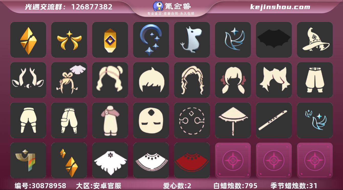 账号类型: 邮箱账号 季节已毕业: 表演季,破晓季,欧若拉季,夜行季,追忆季,拾光季,归巢季,二重奏季,姆明季 完成地图: 晨岛,云野,雨林,霞谷,暮土,禁阁 珍稀物品: 鳐鲲斗篷,白枭,透明蝶翼斗,彩虹围巾 礼包: 蝙蝠套,巫师,欧若拉之翼,九色鹿角,绊爱,鹿角,秋千,茶桌,茶壶,白绒金,福娃,跷跷板,小船,吉他,人声乐器,奔跑发型,橘子,贝壳,黄伞,红伞,兔子,电吉他,猫套,星月头饰,彩虹耳钉,彩虹耳机,新年裤,蝴蝶结,魔法棒,四叶草,小提琴,伯爵面具,创始人,海龟斗篷,青衫落拓礼包,线框斗篷礼包 裤子: 武士裤,背带裤,搓澡巾,妮妮裙子,蓝绿裤,筑巢季·裤子,青鸟尊贵蓬头裤子 面具: 夜行毕业面具,黄眉企鹅面具 面饰: 红耳机,黑框眼镜 项链: 围巾 发型: 归巢毕业发型,若笠,虚荣,留辫蘑菇头 头饰: 牛仔帽,蓝色音乐会,平顶帽 斗篷: 海洋斗,绿芽,粉红绒毛斗篷,遥鲲斗篷,燕尾斗篷,冥龙斗篷 配饰: 雨伞,高音钢琴,姆明抱枕,小红伞,相机,二重奏挂画,鲲灯 亮点: 【优质装备】:表演季,白枭(帝企鹅发),武士裤,破晓季,鳐鲲斗篷,透明蝶翼斗,欧若拉季(欧若拉),归巢毕业发型(五塑彩羽发),高音钢琴(白色高脚钢琴),夜行季,追忆季,妮妮裙子(妮妮长裙),牛仔帽(西部帽),姆明抱枕,小红伞(姆明红伞)(姆明大伞),相机(季卡相机),拾光季,彩虹围巾(五塑彩带斗),归巢季,蓝绿裤(高领舞服),围巾(肩带),蝙蝠套(蝙蝠斗篷)(南瓜头),欧若拉之翼,福娃(福娃礼包)(春之日礼包)(铜钱斗),绊爱(绊爱斗篷)(绊爱礼包),秋千(情人秋千),茶桌(花憩茶桌),茶壶(小憩茶桌),红耳机,九色鹿角(神鹿祝福头饰)(神鹿祝福礼包),鹿角(圣诞鹿角),巫师(巫师帽),白绒金(白雪斗篷),晨岛,云野,雨林,霞谷,墓土(暮土),禁阁,若笠(箬笠),青鸟尊贵蓬头裤子(蓝色燕尾服),二重奏季,二重奏挂画(合奏挂画),姆明季,筑巢季·裤子(设计师长袍),夜行毕业面具(棕熊面具),黄眉企鹅面具,黑框眼镜(粗框眼镜),留辫蘑菇头,...