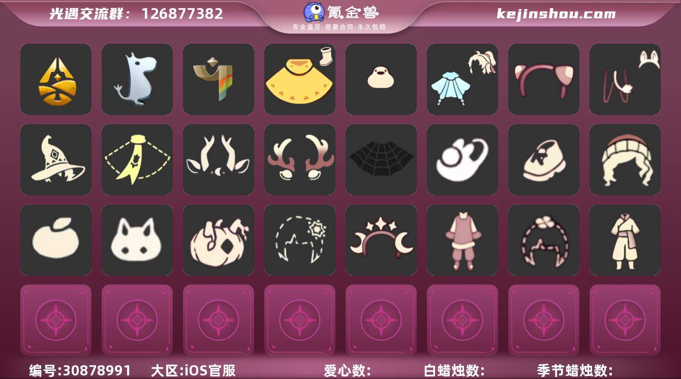 账号类型: 手机账号 季节已毕业: 表演季,破晓季,欧若拉季,夜行季,追忆季,拾光季,归巢季,九色鹿季,青鸟季,双星季 完成地图: 晨岛,雨林,霞谷,暮土 珍稀物品: 白枭,透明蝶翼斗,彩虹围巾 礼包: 绊爱,鹿角,运动鞋,瑞雪,福娃,橘子,贝壳,兔子,南瓜,雪花,水母,星月头饰,蝴蝶结,四叶草,暗彩装扮,创始人,小狗周年发饰,青衫落拓礼包,活力海牛礼包 裤子: 武士裤,背带裤,搓澡巾,王子服,蓝绿裤 面具: 夜行毕业面具,黄眉企鹅面具 面饰: 红耳机,黑框眼镜,青鸟毕业面饰 项链: 围巾 发型: 归巢毕业发型,若笠,虚荣,小王子发型,留辫蘑菇头,飞天盘发 头饰: 牛仔帽,蓝色音乐会,平顶帽 斗篷: 海洋斗,绿芽,粉红绒毛斗篷,遥鲲斗篷,燕尾斗篷,冥龙斗篷,瑞雪斗篷,青鸟毕业斗篷 配饰: 雨伞,高音钢琴,相机,鲲灯 亮点: 【优质装备】:表演季,白枭(帝企鹅发),武士裤,破晓季,透明蝶翼斗,欧若拉季(欧若拉),归巢毕业发型(五塑彩羽发),高音钢琴(白色高脚钢琴),夜行季,追忆季,牛仔帽(西部帽),相机(季卡相机),拾光季,彩虹围巾(五塑彩带斗),归巢季,九色鹿(九色鹿季),王子服(小王子套装),蓝绿裤(高领舞服),围巾(肩带),夜行毕业面具(棕熊面具),黄眉企鹅面具,黑框眼镜(粗框眼镜),小王子发型,留辫蘑菇头,粉红绒毛斗篷(绒毛斗篷),鲲灯(追忆之书),飞天盘发(九色鹿丸子头),青鸟毕业面饰(青鸟面饰),双星季,福娃(福娃礼包)(春之日礼包)(铜钱斗),绊爱(绊爱斗篷)(绊爱礼包),红耳机,鹿角(圣诞鹿角),瑞雪(瑞雪斗篷)(暖冬瑞雪),暗彩装扮(彩虹武士裤),晨岛,雨林,霞谷,墓土(暮土),若笠(箬笠),遥鲲斗篷(双翼遥鲲斗),燕尾斗篷,冥龙斗篷,青鸟季,青鸟毕业斗篷(青鸟斗篷),活力海牛礼包,运动鞋(跃动跑鞋),星月头饰(星月头冠),蝴蝶结(大蝴蝶结),创始人(创始人斗篷),小狗周年发饰(小狗周年头饰),青衫落拓礼包,兔子(玉兔头饰)(玉兔发饰)(兔子发饰),水母(水母肩饰),南瓜(冥龙南瓜),雪...