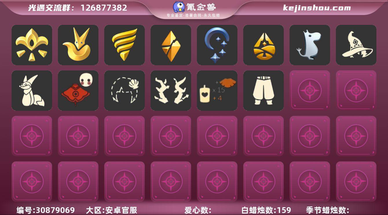 账号类型: 手机账号 季节已毕业: 夜行季,追忆季,拾光季,归巢季,九色鹿季,筑巢季,二重奏季,姆明季,青鸟季,双星季 完成地图: 晨岛,云野,雨林,霞谷,暮土,禁阁 珍稀物品: 彩虹围巾 礼包: 蝙蝠套,巫师,围巾,九色鹿角,大耳狗装扮,绊爱,鹿角,兔子鞋,运动鞋,茶桌,星月头饰,彩虹耳钉,蝴蝶结,四叶草,新年耳钉,海蓝波浪发型,青衫落拓礼包 裤子: 武士裤,背带裤,搓澡巾,击剑裤,妮妮裙子,飞天裤,筑巢季·裤子,青鸟尊贵蓬头裤子 面具: 夜行毕业面具 面饰: 红耳机,黑框眼镜,青鸟毕业面饰 项链: 围巾 发型: 归巢毕业发型,若笠,虚荣,飞天盘发,海蓝波浪发型 头饰: 牛仔帽,蓝色音乐会,平顶帽 斗篷: 海洋斗,绿芽,粉红绒毛斗篷,青鸟毕业斗篷 配饰: 雨伞,筑巢季·小手办,高音钢琴,姆明抱枕,小红伞,相机,二重奏挂画,鲲灯 亮点: 【优质装备】:武士裤,青鸟尊贵蓬头裤子(蓝色燕尾服),归巢毕业发型(五塑彩羽发),筑巢季·小手办(光之子试衣),高音钢琴(白色高脚钢琴),夜行季,追忆季,妮妮裙子(妮妮长裙),牛仔帽(西部帽),姆明抱枕,小红伞(姆明红伞)(姆明大伞),相机(季卡相机),拾光季,彩虹围巾(五塑彩带斗),归巢季,九色鹿(九色鹿季),飞天裤(柔缎花边连)(九色鹿丝带裤),围巾(肩带),筑巢季,二重奏季,二重奏挂画(合奏挂画),姆明季,筑巢季·裤子(设计师长袍),夜行毕业面具(棕熊面具),黑框眼镜(粗框眼镜),粉红绒毛斗篷(绒毛斗篷),鲲灯(追忆之书),飞天盘发(九色鹿丸子头),青鸟季,青鸟毕业面饰(青鸟面饰),青鸟毕业斗篷(青鸟斗篷),双星季,蝙蝠套(蝙蝠斗篷)(南瓜头),绊爱(绊爱斗篷)(绊爱礼包),茶桌(花憩茶桌),红耳机,围巾(小王子斗篷)(小王子围巾),九色鹿角(神鹿祝福头饰)(神鹿祝福礼包),大耳狗装扮,鹿角(圣诞鹿角),巫师(巫师帽),晨岛,云野,雨林,霞谷,墓土(暮土),禁阁,若笠(箬笠),兔子鞋(兔子拖鞋),运动鞋(跃动跑鞋),海蓝波浪发型(海洋发型),星月头饰(星月头冠),...