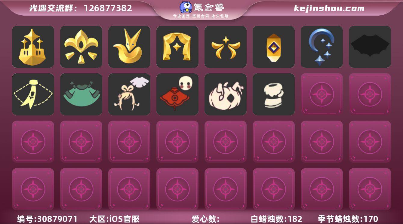 [17187652]iOS官服 邮箱账号 4珍稀物品 11毕业季 6毕业图 1164蜡烛 【珍稀物品】白枭(帝企鹅发),玫瑰花,透明蝶翼斗,鳐鲲斗篷 【季节已毕业】青鸟季,圣岛季,梦想季,集结季,小王子季(王子季),风行季,潜海季,表演季,破晓季,欧若拉季(欧若拉),彩染季 【完成地图】晨岛,云野,雨林,霞谷,墓土(暮土),禁阁 【礼包】周年影院套餐礼包,风之旅人白袍(超凡风之旅人礼包),女巫裙,运动鞋(跃动跑鞋),新年裤(瑞气服饰),彩虹帽(多彩绒帽),南瓜(冥龙南瓜),巫师(巫师帽),蛛网朋克(蜘蛛朋克头),绊爱(绊爱斗篷)(绊爱礼包),橘子(大橘大利),雪花(雪花发夹),贝壳(贝壳发饰),兔子(玉兔头饰)(玉兔发饰)(兔子发饰),星月头饰(星月头冠),新年耳钉(金鳞耳饰),彩虹耳钉(彩虹耳饰),彩虹耳机,枯角(巫树犄角),鹿角(圣诞鹿角),创始人(创始人斗篷),围巾(小王子斗篷)(小王子围巾),星球斗(星球夹克),福娃(福娃礼包)(春之日礼包)(铜钱斗),海龟斗篷,蝙蝠套(蝙蝠斗篷)(南瓜头),蜘蛛斗(蛛丝斗篷)(蛛网斗篷),猫套(皮皮猫斗)(皮皮猫礼包),瑞雪(瑞雪斗篷)(暖冬瑞雪),白绒金(白雪斗篷),竖琴(雏鸟之琴),人声乐器(欧若拉之声),红伞(瑞气纸伞),灯笼(中秋灯笼),黄伞(夏日阳伞),献瑞折扇礼包,秋千(情人秋千),跷跷板(情人跷跷板),茶桌(花憩茶桌),茶壶(小憩茶桌),小狐狸(狐狸背包),小船(情人小船),小狗周年发饰(小狗周年头饰) 【裤子】王子服(小王子套装),蓝绿裤(高领舞服),武士裤,背带裤,搓澡巾,击剑裤 【面具】黄眉企鹅面具,夜行毕业面具(棕熊面具),呼吸面具(潜水面具),贴花面具(丛林黑面具),辉光羚羊面具,凤凰面具 【面饰】青鸟毕业面饰(青鸟面饰),红耳机 【项链】围巾(肩带) 【发型】小王子发型,单侧绑发(单边小辫),留辫蘑菇头,虚荣,若笠(箬笠) 【头饰】平顶帽,蓝色音乐会(蓝色音乐符),行军锅头盔(六边锅帽子)(双耳锅帽子),羽毛发饰(多羽发饰) 【斗篷】燕尾斗篷,冥...