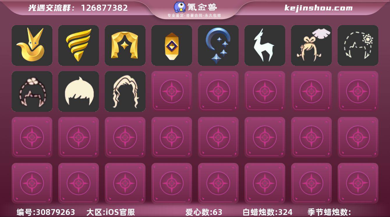 账号类型: 手机账号 季节已毕业: 梦想季,小王子季,风行季,表演季,破晓季,欧若拉季,集结季,追忆季,拾光季,归巢季,九色鹿季,姆明季 完成地图: 晨岛,云野,雨林,霞谷,暮土,禁阁 珍稀物品: 白枭,透明蝶翼斗,玫瑰花,彩虹围巾 礼包: 巫师,围巾,欧若拉之翼,九色鹿角,莲花斗,音乐桌,大耳狗抱枕,大耳狗服饰,大铁头,鹿角,蜘蛛斗,牛仔裤,兔子鞋,大耳狗发饰,运动鞋,秋千,茶桌,茶壶,白绒金,瑞雪,女巫裙,福娃,小船,吉他,人声乐器,奔跑发型,彩虹帽,雪花球,橘子,贝壳,黄伞,兔子,南瓜,枯角,雪花,水母,猫套,猫背饰,星月头饰,彩虹耳钉,彩虹耳机,新年裤,蝴蝶结,奥利奥,四叶草,透明蛛丝,创始人,遥鲲披肩斗篷,姆明饰品套装,恶作剧鸦羽斗篷,妮妮斗篷,海龟斗篷,园丁装扮,衔福献瑞礼包,献瑞折扇礼包,青衫落拓礼包,周年影院套餐礼包 裤子: 武士裤,背带裤,搓澡巾,击剑裤,妮妮裙子,王子服,蓝绿裤,飞天裤,筑巢季·裤子,风行毕业裤子 面具: 凤凰面具,黄眉企鹅面具 面饰: 红耳机,黑框眼镜,青鸟毕业面饰 项链: 围巾 发型: 归巢毕业发型,若笠,虚荣,小王子发型,留辫蘑菇头,飞天盘发 头饰: 行军锅头盔,羽毛发饰,牛仔帽,蓝色音乐会 斗篷: 海洋斗,蟑螂斗,遥鲲斗篷,黄色连帽披风,燕尾斗篷,冥龙斗篷,瑞雪斗篷 配饰: 雨伞,高音钢琴,姆明抱枕,小红伞,相机,玫瑰花,鲲灯 亮点: 【优质装备】:表演季,白枭(帝企鹅发),武士裤,梦想季,小王子季(王子季),风行季,破晓季,透明蝶翼斗,欧若拉季(欧若拉),归巢毕业发型(五塑彩羽发),行军锅头盔(六边锅帽子)(双耳锅帽子),羽毛发饰(多羽发饰),高音钢琴(白色高脚钢琴),集结季,玫瑰花,追忆季,妮妮裙子(妮妮长裙),牛仔帽(西部帽),姆明抱枕,小红伞(姆明红伞)(姆明大伞),相机(季卡相机),拾光季,彩虹围巾(五塑彩带斗),归巢季,九色鹿(九色鹿季),王子服(小王子套装),蓝绿裤(高领舞服),飞天裤(柔缎花边连)(九色鹿丝带裤),蟑螂斗(凤凰斗...