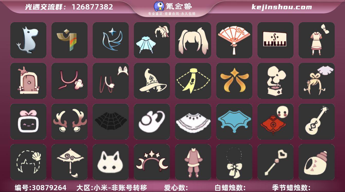 区服:小米服登入方式:手机号蜡烛数量:262爱心:1当前身高10.555最高身高1.251最矮身高13.251已经毕业地图:雨林,霞谷已经毕业季节:青鸟季,彩染季,姆明季稀有礼包:祥云瑞气服饰,爱丽丝围裙套装,玉兔拖鞋,雪人暖心靴,星月头冠,金鳞耳坠,圣诞鹿角,优雅领结,水母肩饰,姆明饰品套装,巫师帽,绊爱套装,渐变双马尾发型,贝壳,玉兔,四叶草头饰,小王子围巾,AURORA 之翼,新春福娃,蜘蛛斗篷,白雪斗篷,暖冬瑞雪,盘龙围巾斗篷,音韵吉他,惊喜手杖,祥云瑞气纸伞,献瑞折扇礼包,自然之声,中国绊爱大铁头,古典音乐桌椅,仙境茶会门扉,立式钢琴'青衫落拓礼包'必胜客联动热门物品:正太头,樱花头,猫猫头,武士裤,花环头饰,宴会围巾,虚荣发型,白金斗篷,吉他,铃铛,雨伞