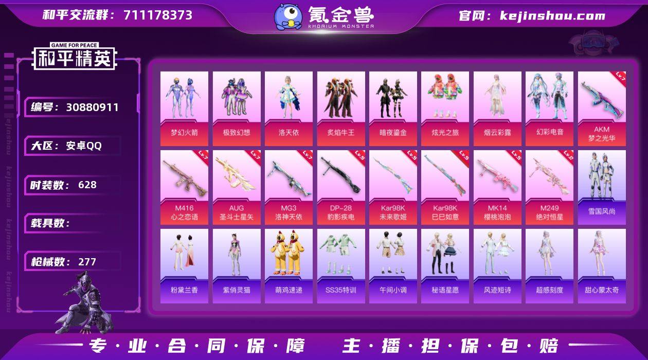 实名: 可修改 时装数: 628 枪械数: 277 热门装扮: 梦幻火箭(新101),呆萌铁蟹,极致幻想,洛天依,炙焰牛王,暗夜鎏金,炫光之旅,烟云彩露,幻彩电音 稀有枪皮: MG3洛神天依,M416心之恋语,AKM梦之光华,Kar98K未来歌姬,Kar98K-巳巳如意,MK14-樱桃泡泡,AUG-圣斗士星矢,DP-28-豹影疾电,M249-绝对恒星 亮点: 【优质装备】:MG3洛神天依,M416心之恋语,梦幻火箭(新101) ,极致幻想,AKM梦之光华,洛天依,Kar98K未来歌姬,七级MG3-洛神天依,七级AKM-梦之光华,七级M416-心之恋语,MK14-樱桃泡泡,AUG-圣斗士星矢,七级AUG-圣斗士星矢,幻彩电音,Kar98K-巳巳如意