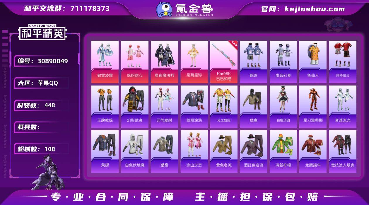 热力值:33512 时装数:448 枪械数:108 战备数:111 游戏等级:64 卓越印记:0 传奇印记:0 绝世印记:0 傲雪凌霜,呆萌星弥,飒粉甜心,星夜魔法师 五级Kar98K-巳巳如意 暖熊萌萌飞行器,碧影闪光降落伞,彩虹独角兽降落伞,环太平洋降落伞,绒雪飘舞降落伞,未来歌姬降落伞 冰川特警,白糯汤圆,白色伏地魔,岑岑玉浪,长空猛禽,都市魅力,飞驰魅影,绯格组合,飞行日记,格斗先锋,龟仙人,光之冒险,华灯初上,鹤鸣,湖蓝色名流,黑色伏地魔,黄色伏地魔,黄色名流,黄色运动,红色运动,幻世战舞者,和煦暖阳,幻影武者,极地朋克,军刀雅典娜,酒红色名流,惊鸿侠骨,橘黑制服,娇憨猪猪,竞技达人朋克,竞技名士,坚韧舞者,极速红龙,极速竞梦,锦衣飞扬,酷潮明星,龙的传人,猎鹰,黎明保卫者,猎梦纪元,蓝色运动,龙腾端午,冷焰舞者,猛禽,萌黄之夏,魅力单车,麻辣教官,懵萌河马,萌趣咩咩,霓虹极客,柠萌假日,牛气冲天,牛气满满,暖心橘喵,破蛋小黄鸡,破晓战魂,轻风白浪,绮丽涂鸦,青年教官,青涩年华,清新柠檬,青玉碎影,荣耀,人气偶像,热血青春,水晶王族,深蓝色名流,沙漠毒蛇,神气柴柴,SS18特训,SS19特训,SS20特训,SS21特训,SS22特训,SS23特训,SS24特训,SS25特训,SS26特训,SS31特训套装,SS32特训套装,SS33特训套装,探宝勇士,甜蜜菠萝,甜蜜熊情侣,特殊使命,涂山之恋,特训学院,甜心亚梦,田园牧歌,特战英豪,完美偶像,王牌教练,炫蓝之夏,夏日音浪,虚音幻奏,异彩先驱,耀粉歌者,荧惑魅影,雨林探路者,元气发射,音速流光,玉兔迎春,野性战心,战地督导,智慧隐士,灼焰舞者 AA12-G-绒兔团圆,AC-VAL-彩虹甜喵,AC-VAL-天降萌叽,AC-VAL-甜心亚梦,AKM-龙的传人,AKM-奇异狩猎者,AKM-筑梦精灵,AKM-灼热熔岩,AMR-妙红点点,AUG-青春冒险家,AUG-耀粉歌者,AWM-炙焰牛王,爆炸猎弓-惊鸿侠骨,DBS-甜心亚梦,DP-28-彩虹符号,DP-28-甜心亚梦,G36C-暗夜玫瑰,G36C-懵萌河马,G36C-炙焰牛王,GROZA-懵萌河马,GROZA-田园牧歌,GROZA-异彩先驱,GROZA-影袭,Kar98K-飞驰魅影,Kar98K-炫彩节奏,M16A4-幻世战舞者,M16A4-蓝色火焰,M16A4-甜心亚梦,M200-惊鸿侠骨,M200-乌木金纹,M249-彩虹符号,M249-糯团青竹,M249-破晓战魂,M24-炫彩节奏,M416-暗星紫秘,M416-绯红前夜,M416-糯团青竹,M417-惊鸿侠骨,M762-绒雪飘舞,M762-天降萌叽,MG3-幻世战舞者,MG3-惊鸿侠骨,MG3-瑞龙福将,蜜獾-天降萌叽,蜜獾-娇憨猪猪,Mini14-耀粉歌者,Mini14-涂山之恋,Mini14-异彩先驱,Mk14-暗星紫秘,MK20-H-墨染幽兰,MP5K-异彩先驱,莫辛纳甘-懵萌河马,P90-飞驰魅影,P90-巳巳如意,平底锅-飞驰魅影,平底锅-惊鸿侠骨,平底锅-娇憨猪猪,平底锅-懵萌河马,平底锅-甜心亚梦,平底锅-田园牧歌,平底锅-异彩先驱,PKM-懵萌河马,QBU-飒粉甜心,QBZ-彩虹符号,QBZ-飞驰魅影,撬棍-环太平洋,S12K-幻世战舞者,S12K-娇憨猪猪,S12K-破晓战魂,S12K-玩趣呆呆,S1897-飞驰魅影,S1897-炫彩节奏,S1897-星夜魔法师,S686-橘柚倾心,SCAR-L-黄金龙骨,SCAR-L-红色方程式,SCAR-L-炫彩节奏,SCAR-L-
