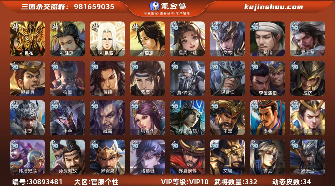 VIP等级: VIP10 官阶: 大将军 武将数量: 332 动态皮肤数量: 34 神将: 神陆逊,神吕布,神吕蒙,神周瑜 魏国武将: 戏志才,曹纯,程昱,界曹真,界于禁,马钧,文鸯,唐咨-魏,徐庶,张辽,SP蔡文姬,SP关羽,SP贾诩,SP姜维,曹昂,曹操,曹冲,曹丕,曹仁,曹叡,曹嵩,贾逵,王异,鲁芝,界满宠,曹休,满宠,荀攸,王基,钟繇,蒯越蒯良,郭嘉,牵招,荀彧,阮慧,杜畿,界郭嘉,崔琰,界荀彧,朱灵,界甄姬,吕虔,界王异,界许褚,界郭淮,华歆,陈群,界邓艾,界曹休,袁涣,李通,乐进,辛宪英,谋曹仁,郭淮,毛玠,夏侯惇,曹植,司马朗,谋于禁,界曹操,星周不疑,许褚,界张辽,谋徐晃,张郃,钟会,文聘,曹彰,界夏侯惇,诸葛诞,司马懿,甄姬,界徐晃,徐晃,孙资刘放,韩浩史涣,曹真,典韦,夏侯渊,李典,于禁,王双,邓艾,界司马懿,张春华,臧霸,牛金,朱灵(国战),成济,李昭焦伯,势钟会 蜀国武将: 董允,花鬘,谯周,张星彩,赵襄,周群,诸葛瞻,谋马超,谋赵云,徐庶,界魏延,杨仪,吕凯,界关羽,界诸葛亮,邓芝,界伊籍,胡金定,严颜,界黄月英,赵云,张松,彭羕,李丰,界刘备,谋姜维,刘封,糜竺,谋庞统,黄月英,关羽,吴懿,界廖化,向宠,祝融,张飞,黄皓,魏延,界周仓,马忠,界法正,糜夫人,刘禅,界赵云,张翼,关银屏,SP孙尚香,SP徐庶,卧龙诸葛,周仓,界关兴张苞,诸葛亮,界张飞,界卧龙诸葛,法正,赵统赵广,陈到,界马岱,关平,马岱,界庞统,庞统,诸葛果,谋张飞,马谡,马超,霍峻,廖化,关兴张苞,孟获,夏侯氏,姜维,黄忠,刘备,界马超,马良,蒋琬费祎,刘谌,彭羕(国战),甘夫人 吴国武将: 界步练师,界徐盛,骆统,孙寒华,文鸯,潘濬,周泰,全琮,吕蒙,诸葛恪,界孙尚香,界顾雍,大乔小乔,桥公,界程普,许贡,丁奉,谋吕蒙,界全琮,孙茹,蒋钦,顾雍,阚泽,孙休,严畯,界孙权,界孙休,祖茂,濮阳兴,界吕蒙,陈武董袭,孙登,凌操,朱治,孙尚香,程普,大乔,韩当,陆逊,诸葛瑾,吕范,太史慈,谋大乔,周妃,虞翻,界黄盖,孙鲁班,界周瑜,界潘璋马忠,卫温诸葛直,孙...