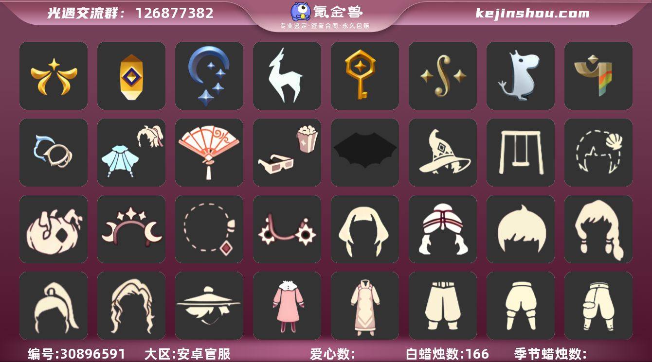 账号类型: 手机账号 季节已毕业: 预言季,梦想季,小王子季,风行季,潜海季,表演季,破晓季,欧若拉季,集结季,追忆季,九色鹿季,筑巢季,二重奏季,姆明季,彩染季,青鸟季,双星季,迁徙季 完成地图: 晨岛,云野,雨林,霞谷,暮土,禁阁 珍稀物品: 阿努比斯(狗头),白枭,透明蝶翼斗,玫瑰花 礼包: 蝙蝠套,巫师,围巾,欧若拉之翼,九色鹿角,绊爱,鹿角,蜘蛛斗,秋千,茶桌,茶壶,白绒金,瑞雪,福娃,跷跷板,小船,吉他,灯笼,致爱装扮,人声乐器,奔跑发型,彩虹帽,雪花球,绒帽,橘子,红伞,兔子,南瓜,枯角,水母,猫套,猫背饰,星月头饰,彩虹耳机,新年裤,蝴蝶结,魔法棒,四叶草,创始人,海龟斗篷,奉献斗篷 裤子: 武士裤,背带裤,搓澡巾,击剑裤,妮妮裙子,王子服,蓝绿裤,飞天裤,筑巢季·裤子,青鸟尊贵蓬头裤子 面具: 阿努比斯,凤凰面具,贴花面具,呼吸面具,黄眉企鹅面具,辉光羚羊面具 面饰: 红耳机,青鸟毕业面饰 项链: 围巾 发型: 若笠,虚荣,单侧绑发,小王子发型,留辫蘑菇头,飞天盘发 头饰: 行军锅头盔,羽毛发饰,蓝色音乐会,平顶帽 斗篷: 海洋斗,蟑螂斗,绿芽,遥鲲斗篷,黄色连帽披风,燕尾斗篷,冥龙斗篷,彩染围巾斗篷,奉献斗篷,青鸟毕业斗篷 配饰: 雨伞,筑巢季·小手办,高音钢琴,姆明抱枕,小红伞,玫瑰花,二重奏挂画,圆鼓,鲲灯 亮点: 【优质装备】:预言季,阿努比斯(狗头),表演季,白枭(帝企鹅发),武士裤,梦想季,小王子季(王子季),风行季,潜海季,破晓季,透明蝶翼斗,欧若拉季(欧若拉),行军锅头盔(六边锅帽子)(双耳锅帽子),羽毛发饰(多羽发饰),筑巢季·小手办(光之子试衣),高音钢琴(白色高脚钢琴),集结季,玫瑰花,追忆季,妮妮裙子(妮妮长裙),姆明抱枕,小红伞(姆明红伞)(姆明大伞),九色鹿(九色鹿季),王子服(小王子套装),蓝绿裤(高领舞服),飞天裤(柔缎花边连)(九色鹿丝带裤),蟑螂斗(凤凰斗篷),围巾(肩带),筑巢季,蝙蝠套(蝙蝠斗篷)(南瓜头),欧若拉之翼,福娃(福娃礼包)(春...