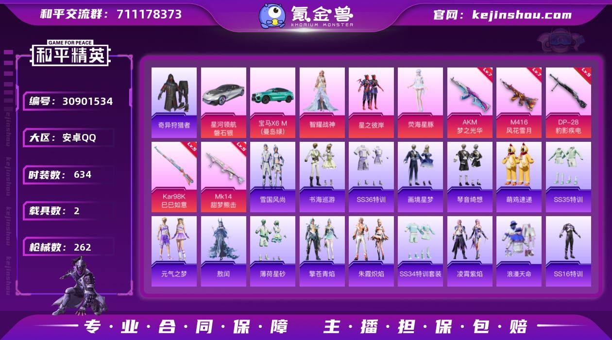 热力值:78038 载具数:2 时装数:634 枪械数:262 战备数:192 游戏等级:72 卓越印记:5 传奇印记:2 绝世印记:1 星之彼岸,荧海星豚,智耀战神 七级AKM-梦之光华,七级M416-风花雪月,五级DP-28-豹影疾电,五级Kar98K-巳巳如意,五级MK14-甜梦熊击 宝马X6 M(曼岛绿),星河领航(磐石银) 炫彩糖果降落伞,异瞳寒姬降落伞,喜羊羊与灰太狼降落伞,梦幻火箭飞行器,终晖之翼飞行器,垂柳戏鸭降落伞,春暖花开降落伞,幻彩电音降落伞,葫芦兄弟降落伞,激战未来降落伞,临安公主降落伞,洛神天依降落伞,梦幻火箭降落伞,甜蜜誓约降落伞,炫光之旅降落伞,炫紫旋律降落伞,银刃赛罗降落伞,最终圣卫者降落伞 雪国风尚,画境星梦,琴音绮想,书海巡游,SS36特训,奇异狩猎者,萌鸡速递,SS35特训,元气之梦,敖闰,薄荷星砂,凌霄紫焰,擎苍青焰,SS34特训套装,朱霞炽焰,冰川特警,冰冻风暴,缤纷果语,暴风机械师,缤纷焰火,北国孤狼,滨海厨神,滨海假日,冰河战士,白色伏地魔,爆竹金鼠,春光漫游,雏菊兔兔,长空猛禽,潮流游乐家,传奇侦探,炽焰拳师,顶瓜瓜,呆萌铁蟹,飞驰魅影,疯狂小兔子,福星高照,格斗专家,光矢逐梦,光之冒险,虎虎生威吉莉,湖蓝色名流,好奇恐龙,灰色格斗者,幻世猎手,黄色运动,幻世战舞者,极地朋克,娇憨猪猪,击剑大师,竞技名士,竞技勇士朋克,吉莉礼服,激萌罗小黑,精神漫游,金鼠迎春,街头风暴,金羽特工,金耀舞者,绛羽幽主,酷潮明星,空岛之星,科技之星,快闪甜心,狂沙舞者,空投萌叽,蓝冰羽,蓝彩潮人,凛冬战士,萝兰蝴蝶,浪漫波比,浪漫天命,蓝色守护者,蓝色运动,恋语绒绒,摩艾涂鸦,漫步者,猛禽,萌黄之夏,魅力单车,麻辣教官,萌趣咩咩,萌趣颜团子,梦之呓语,逆风勇士,霓虹极客,霓虹街区,霓虹热舞,牛气冲天,牛气满满,暖心橘喵,破蛋小黄鸡,攀登者,青春冒险家,绮丽涂鸦,奇趣章鱼,青团波波,骑行爱好者,云朵鹅,瑞龙福将,热血青春,热血骑手,熔岩使者,圣诞大吉,时空追击者,森林猎手,沙漠兵团,SS12特训,SS13特训,SS14特训,SS15特训,SS16特训,SS17特训,SS18特训,SS19特训,SS20特训,SS21特训,SS22特训,SS30特训套装,SS31特训套装,SS32特训套装,SS33特训套装,SS5特训,SS6特训,SS7特训,SS8特训,天籁歌者,甜蜜告白,豚鼠丹丹,糖霜甜心,糖糖葫芦,团圆交子,特种空勤,特种颜团子,特战装甲,迅捷之星,雪绒豹,旭日情侣,夏日音浪,雪山精英,雪山征服者,雪兔飞飞,蝎王蛇后,原初圣火,异彩先驱,耀粉歌者,云丝凤蟒,音速流光,玉兔迎春,乐音,鹰眼刺客,鱼渊荷华,燕燕于飞,异域银装,战地菁英,折梦之诗,紫幽梦,治愈之星 PKM-啾咪啾咪,AA12-G-画境星梦,ACE32-画境星梦,M1加兰德-画境星梦,MK12-乌木金纹,MP5K-画境星梦,平底锅-画境星梦,UZI-炫彩糖果,AKM-霓彩脉冲,Famas-霓彩脉冲,SLR-霓彩脉冲,十字弩-异瞳寒姬,S12K-霓彩脉冲,AKM-涂鸦街区,电击枪-喜羊羊与灰太狼,M200-无垠阁,G36C-蛇蝎美人,M249-冰晶雪宝,MG-36-薄荷星砂,AC-VAL-彩虹甜喵,AC-VAL-快闪甜心,AC-VAL-天降萌叽,AKM-彩虹符号,AKM-虎虎生威,AKM-萌趣颜团子,AKM-霓虹街区,AKM-破晓战魂,AKM-生命誓言,AKM-星之彼岸,AKM-夜灯,AKS-74U-鬼刀,ARX-凌霄紫焰,AUG-青春冒险家,AUG-天降萌叽,