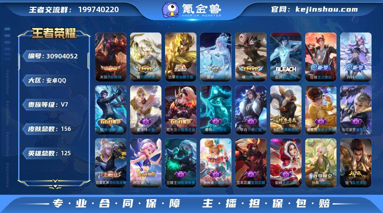V7 1典藏 9传说 125英雄 156皮肤 可修改实名 【英雄全皮】:影全皮 【稀有英雄】:大司命,韩信(韩跳跳),夏洛特(夏师傅),艾琳,橘右京(橘子),娜可露露(鸟人),不知火舞,赵云,金蝉(唐僧),戈娅 【荣耀水晶】:赤影疾锋 【传说皮】:黄金狮子座,云鹰飞将(小将军),炽阳神光,音你心动-周瑜,末日机甲-孙策,霜月吟 【珍宝阁皮】:万物之道 【赛季/战令皮】:噬灭天穹(s37),古海寻踪(s33),海盐诗旅(s30),擒涛扼浪(s31),探海日志(s32),流音漫舞,地狱燃心,剑破天穹(s35),天穹祈灯(s34),青焰无极,苍威无极,天穹之誓(s36),沙漠行僧(s26),幻夜卜梦,金庭之子(s27),大漠名商(s28),云中旅人(s29) 【史诗皮】:化蝶舞,龙之律动,石田雨龙,百相守梦-黄忠,茶境仙,星界特工,涂山容容,紫霞仙子,黄金分割率,千年之狐,永昼,江河有灵,高渐离燃音魔法,真我赫兹(百里守约),偶像歌手,猫狗日记-孙策,乱世虎臣,节奏热浪,摇滚巨星,水果甜心,天才门将,暗隐猎兽者,幽灵船长,鬼剑武藏,水晶猎龙者,曙光守护者,热力回旋,原初追逐者,圣诞恋歌,鹰眼统帅,魅力维加斯,赏金猎手 【限定皮】:愿照·九州拓(澜年限),逐霄战戟,鸣野蒿,梁祝,孙行者,启示之音,山海·玄木吟(马可年限) 【普通皮】:熔金海岸,苍林狼骑,访茗客,魅影绮裳,铁骨偃魂,谧流熔炉,大乔绒语心约,金福满堂,刘备异域游侠,经纬探寻者,街头霸王,荣光之誓,逆浪荇歌,爆裂喵拳,景韶洛都,玫蓝誓约,虚灵犬护,布丁狗之约,危途狂花,聚星闪耀,潮玩造梦师,西部游侠,王牌新星,暖冬絮语(程咬金),破局者,幻夜行动,决胜大满贯,妲己灵卜魔法,鬼谷子天穹祈灯(S34),蔚蓝守将,万事如意,龙腾万里,花好人间,归虚梦演-鲁班大师,归虚梦演-曜,归虚梦演-西施,海滩丽影,海滩派对,皇家上将,魔术师,掌控之力,坚韧之力,敏锐之力,乓乓大师,黄金武士,大发明家,天使之翼,功夫老勺,哥特玫瑰,鲨炮海盗猫,教廷特使,阴阳师,兔女郎,死亡骑士,白执事...