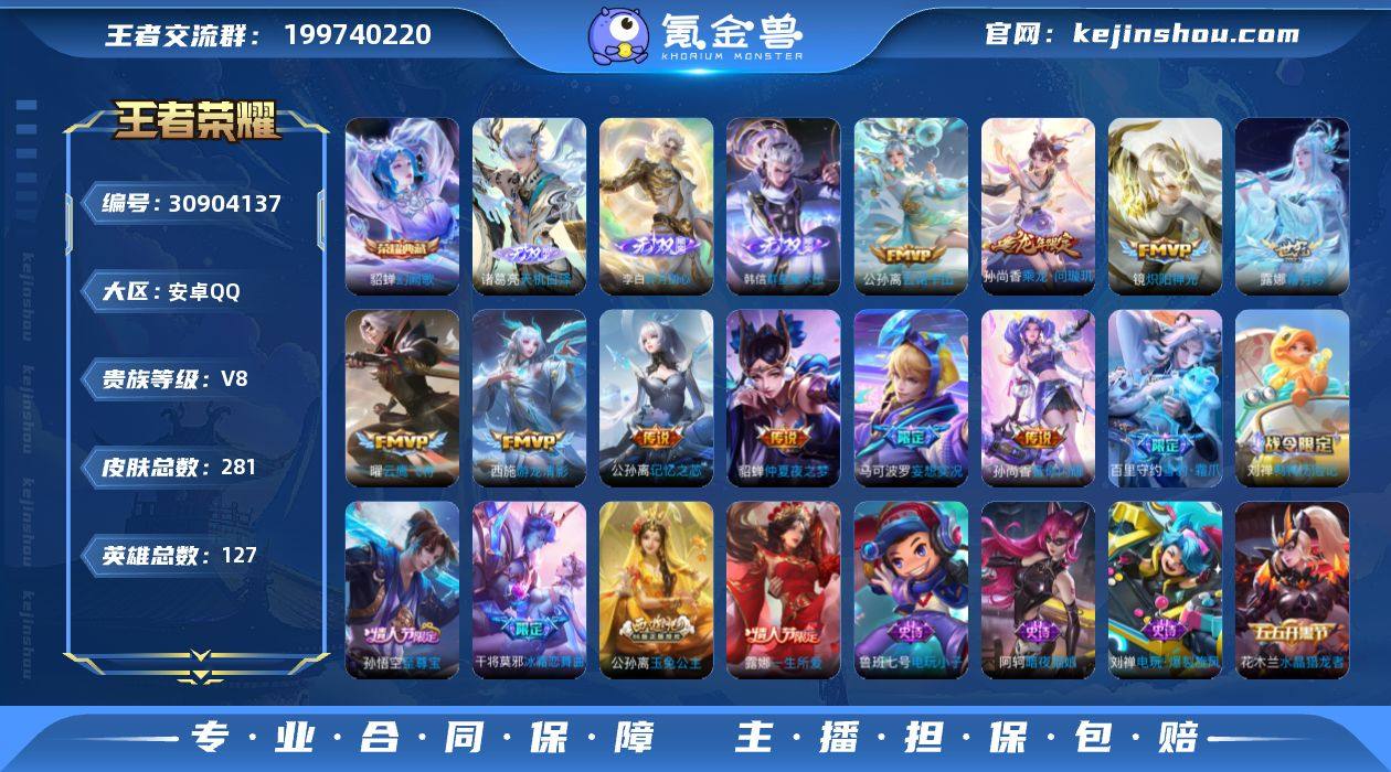 V9 1典藏 4无双 19传说 127英雄 281皮肤 可修改实名 【英雄全皮】:敖隐全皮,孙权全皮,鬼谷子全皮 【稀有英雄】:敖隐(小龙人),大司命,嬴政(始皇帝),韩信(韩跳跳),夏洛特(夏师傅),艾琳,橘右京(橘子),娜可露露(鸟人),不知火舞,赵云,金蝉(唐僧),戈娅 【荣耀水晶】:幻阙歌(貂蝉典藏) 【无双皮】:神罪,天机白泽,韩信群星魔术团(韩信无双),碎月剑心(李白无双) 【传说皮】:乘龙·问璇玑(孙尚香年限),云诺千山,神树通天,游龙清影(小青龙),仲夏夜之梦(大飞蛾),云鹰飞将(小将军),炽阳神光,时之恋人-刘备(电焊工),音你闪耀(rap皮),记忆之芯(机甲兔),妄想实况,霜月吟,澜逐花归海 【珍宝阁皮】:万物之道,优雅恋人,女武神,玩趣恶龙 【赛季/战令皮】:噬灭天穹(s37),古海寻踪(s33),星界游侠,海盐诗旅(s30),擒涛扼浪(s31),潮玩骑兵,奇幻香踪,探海日志(s32),驭风魔法,玲珑珍味,流音漫舞,顽趣-梦奇,地狱燃心,剑破天穹(s35),天穹祈灯(s34),暖冬·兔眠,重明(s11),穷奇(s12),御霄(s14),御旌(s15),御銮(s16),朔风刀(s17),混沌棋(s18),疑决卦(s19),醍醐杖(s20),原初探秘者(s21),万华元夜(s22),演武夺筹(s23),驱傩正仪(s24),猎兽之王,白昼王子,夺宝奇兵,迷踪丽影,西部大镖客-猪八戒,暗影游猎(游乐娃子),真爱魔法,沙漠行僧(s26),吟游魔法,夜都怪侠,金庭之子(s27),电玩高手(电玩铁子),午后时光,大漠名商(s28),云中旅人(s29),超时空战士-钟无艳,落雪兰心 【史诗皮】:巫礼祀神,鸭鸭历险记-刘禅,雪豹·霜爪,百相守梦-黄忠,涂山容容,万灵启世,紫霞仙子,电玩小子(小书包),黄金分割率,特工魅影,江河有灵,高渐离燃音魔法,百解令(蒙犽),蒙恬荣光圣徽,冰冠公主,偶像歌手,电玩·爆裂旋风,暗夜猫娘,猫狗日记-孙策,节奏热浪,女仆咖啡,水果甜心,绅士熊喵,星夜王子,心灵骇客,功夫厨神,德古拉伯爵,暗隐猎兽者,幽灵船长,鬼剑