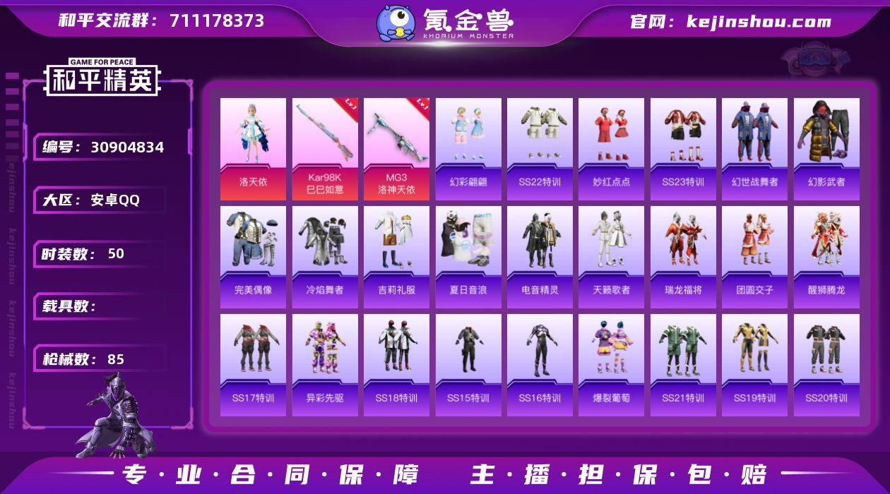 7级MG3-洛神天依-洛天依-1粉装2特效枪】Q等级36(2太阳)可二次- 安卓Q-1粉装2特效枪5热门55套装85枪皮 24422热力值 1印记 历史超级王牌1星 【1粉装】 洛天依 【2特效枪】 Kar98K-巳巳如意 (5级) MG3-洛神天依 (7级) 【5热门】电音精灵 华灯初上 懵萌河马 神气柴柴 醒狮腾龙 团圆交子 瑞龙福将 破蛋小黄鸡 M762-瑞龙福将安卓Q区-1粉装-2特效枪-24422热力值-1王牌印记-55套装-85枪皮【优质套装】: 洛天依【特效枪等级】:Kar98K-巳巳如意(五级- Kar98K-巳巳如意)MG3-洛神天依(七级- MG3-洛神天依)【优质武器皮肤】: Kar98K-巳巳如意 MG3-洛神天依【稀有武器皮肤】: Kar98K-巳巳如意 MG3-洛神天依 蜜獾-乌木金纹 M416-红色方程式 M416-蓝色火焰 M416-夜灯 M416-糯团青竹 AKM-夜灯 AKM-海渊国主 AKM-破晓战魂 AKM-龙的传人 AKM-虎虎生威 AKM-霓虹街区 SCAR-L-红色方程式 SCAR-L-玉兔迎春 SCAR-L-炫彩节奏 M16A4-幻世战舞者 GROZA-异彩先驱 GROZA-懵萌河马 AUG-耀粉歌者 AUG-灵符少年 QBZ-洛神天依 QBZ-彩虹符号 M762-瑞龙福将 M762-暗夜鎏金 M762-天降萌叽 Mk47-乌木金纹 Mk47-妙红点点 Mk47-洛神天依 G36C-乌木金纹 G36C-懵萌河马 AC-VAL-天降萌叽 AC-VAL-乌木金纹 蜜獾-天降萌叽 Kar98K-乌木金纹 Kar98K-洛神天依 Kar98K-彩虹符号 M24-乌木金纹 AWM-音爆索尼克 Win94-瑞龙福将 莫辛纳甘-乌木金纹 莫辛纳甘-懵萌河马 AMR-妙红点点 Mini14-炫彩节奏 Mini14-异彩先驱 Mini14-海渊国主 Mk14-乌木金纹 SLR-彩虹符号 UZI-炫彩节奏 UMP45-夜灯 Vector-暗夜玫瑰 Vector-生命誓言 Vector-彩虹符号 汤姆