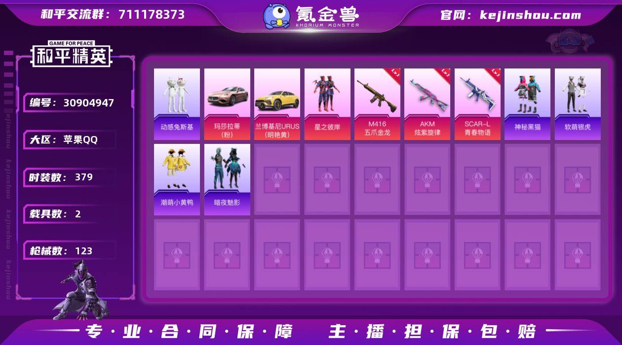 2粉装 3特效枪 2.0载具 9印记 可二次 【热门装扮】潮萌小黄鸭,神秘黑猫,软萌银虎,动感兔斯基,星之彼岸,暗夜魅影,绯穹魔姬 【载具】兰博基尼URUS(明艳黄),玛莎拉蒂Ghibli(粉) 【稀有枪皮】SCAR-L青春物语,M416五爪金龙,AKM炫紫旋律 【七级特效枪】七级M416-五爪金龙 【五级特效枪】五级SCAR-L-青春物语,五级AKM-炫紫旋律 【紫色装扮】骑行爱好者,竞技名士,长空猛禽,竞技勇士朋克,黎明保卫者,灰色守护者,时尚圣诞,特战装甲,特殊使命,特训学院,特训学院,滨海假日,滨海厨神,幻影武者,暗金炫舞,神秘领域,绮丽涂鸦,朋克治安官,夜莺强袭者,都市漫游者,金羽特工,沙漠兵团,丛林猎人,传奇侦探,甜蜜熊情侣,龙魂突击队,幻影公爵,麻辣教官,破蛋小黄鸡,舞夜骑士,北国孤狼,SS6特训,拳皇97草薙京,炽焰拳师,格斗专家,跃动心情,SS7特训,黑色刀锋,核芯基因,精神漫游,鹤鸣,霓虹街区,SS10特训,萌黄之夏,夏日音浪,SS9特训,神秘舞者,丝绸行者,牛气满满,SS11特训,诡谋托雷基亚,原初圣火,逆风勇士,娴静芝兰,萌趣颜团子,特种颜团子,SS12特训,牛气冲天,SS18特训,耀粉歌者,治愈之星,科技之星,SS13特训,SS14特训,SS15特训,SS16特训,暴风机械师,时空追击者,SS17特训,瑞龙福将,团圆交子,冰爽风暴,爆裂葡萄,极乐追光,异彩先驱,空投萌叽,SS19特训,飞驰魅影,音速流光,SS20特训,SS21特训,SS22特训,绯格组合,SS23特训,神气柴柴,懵萌河马,王牌教练,SS25特训,惊鸿侠骨,锦衣飞扬,龙的传人,SS26特训,快闪甜心,春光漫游,幻羽潜行,星渊小夜曲,SS35特训,SS24特训(SS24特训套装),SS32特训套装,SS34特训套装,SS33特训套装,炫蓝之夏,虎虎生威吉莉,福星高照,霓虹极客 【优质战备】飞行器-天之羽翼,阿狸红降落伞,激战未来降落伞,神秘黑猫降落伞,幻影战神降落伞,古堡领主降落伞,暗夜玫瑰降落伞