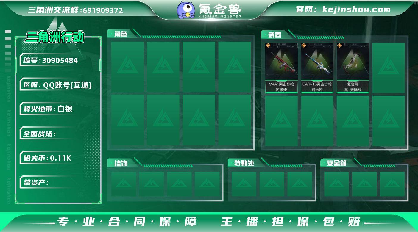 [14911772]总资产:231.9M 11传说枪械 哈夫币:110K 可二次 可修改实名 【烽火地带段位】:白银 【全面战场段位】:无段位 【传说武器皮肤】:M16A4突击步枪-狩猎时刻,G3战斗步枪-狩猎时刻,Vector冲锋枪-狩猎时刻,复合弓-黑-天际线,CAR-15突击步枪-阿米娅,M4A1突击步枪-阿米娅,G3战斗步枪-骑士,勇士冲锋枪-能天使-午夜邮差,Vector冲锋枪-能天使-午夜邮差,M250通用机枪-骑士之心,SCAR-H战斗步枪-启航 【史诗武器皮肤】:ASh-12战斗步枪-无极限,Mini-14射手步枪-守护者,K437突击步枪-守护者,MP5冲锋枪-战术竞备,Vector冲锋枪-猎鳄行动