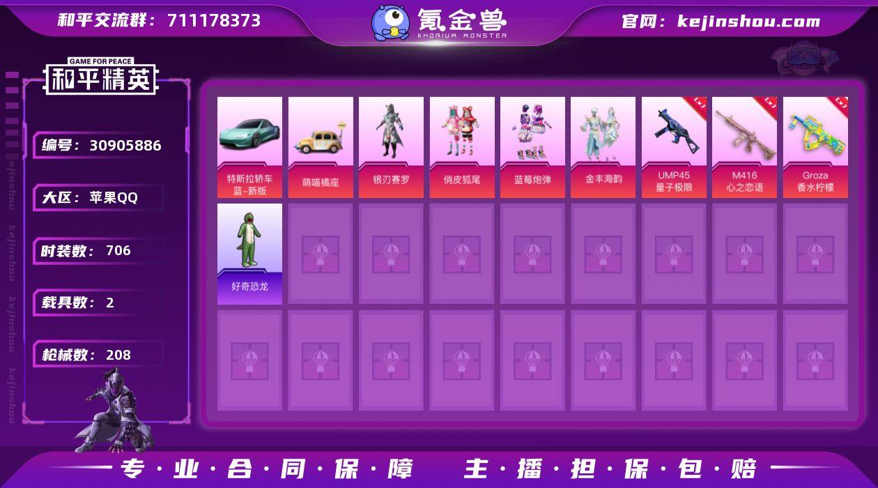 4粉装 6特效枪 2载具 11印记 可二次 可修改实名 身法装备:8号机(新粉螳螂) 优质装备:特斯拉Roadster(水滴蓝),M416心之恋语,Groza香水柠檬,银刃赛罗,俏皮狐尾,七级GROZA-香水柠檬,七级M416-心之恋语,UMP45量子极限,AUG-暖羊咩咩,Kar98K-巳巳如意 热门装扮:蓝莓炮弹,金丰海韵,好奇恐龙 载具:空客H135-蔚蓝之翼,萌喵橘座 稀有枪皮:DP-28-豹影疾电 五级特效枪:五级UMP45-量子极限,五级Kar98K-巳巳如意,五级DP-28-豹影疾电,五级AUG-暖羊咩咩 紫色装扮:SS22特训,SS23特训,娇憨猪猪,酸甜橘柚,暖心橘喵,萌趣咩咩,SS21特训,SS31特训套装,SS2特训,SS3特训,SS5特训,人气偶像,军械专家,冰原使者,,冷焰舞者,凛冬战士,刚毅裁决者,北国孤狼,千禧之恋,SS30特训套装,SS33特训套装,青涩时光,SS20特训,青春冒险家,潮流游乐家,SS15特训,暗夜傀儡,时空追击者,暴风机械师,SS16特训,爆裂葡萄,快乐星愿,遗落祭司,冰爽海盐,银白舞王,SS13特训,骁骑迪迦,诡谋托雷基亚,浪漫樱花,治愈之星,迅捷之星,科技之星,SS14特训,萌趣颜团子,特种颜团子,飞驰魅影,音速流光,SS19特训,吉莉礼服,雪兔飞飞,瑞龙福将,团圆交子,醒狮腾龙,SS17特训,炫光向阳,异彩先驱,缤纷焰火,SS18特训,都市魅力,酒红色名流,酷潮明星,野性战心,长空猛禽,雪山征服者,雪山精英,霓虹极客,霓虹街区,青年教官,迎春赐吉,缤纷果语,荣耀,蓝彩潮人,蓝色运动,虎虎生威吉莉,街头潮人,飞行日记,龙腾端午,骑行爱好者,魅力单车,鹤鸣,麻辣教官,黄色伏地魔,黄色名流,黄色运动,黎明保卫者,黑色伏地魔,龙的传人,龟仙人,冰河战士,龙魂突击队,蝶变,香桃花海,熔岩游骑兵连帽夹克,极速红龙,柠萌假日,格斗先锋,橘黑制服,沙漠兵团,海滨突袭者,深蓝色名流,滨海假日,幻影武者,圣诞大吉,坚韧舞者,夏日音浪,夜莺强袭者,完美偶像,帅气教官,幻世战舞者,怒火燎原,战地督导,战地菁英,探宝勇
