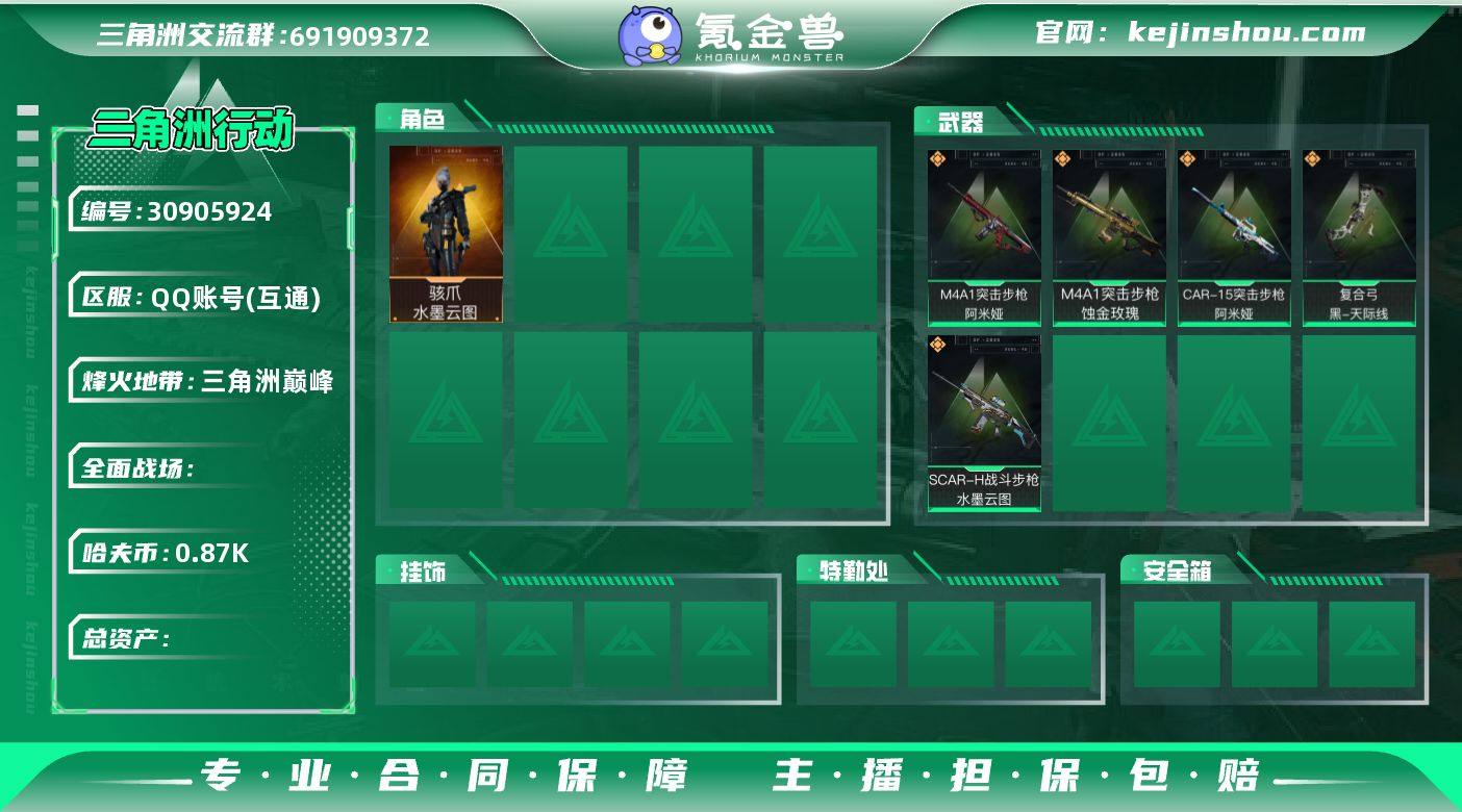 [14583252]总资产:275.5M 1干员外观 1近战传说 23传说枪械 哈夫币:875.958K 可二次 可修改实名 【烽火地带段位】:三角洲巅峰 【全面战场段位】:无段位 【干员外观】:骇爪-水墨云图 【传说武器皮肤】:近战-信条,SCAR-H战斗步枪-水墨云图,腾龙突击步枪-捞点薯条,AWM狙击步枪-捞点薯条,M16A4突击步枪-狩猎时刻,G3战斗步枪-狩猎时刻,Vector冲锋枪-狩猎时刻,复合弓-黑-天际线,CAR-15突击步枪-阿米娅,M4A1突击步枪-阿米娅,725双管霰弹枪-送葬人-无题密令,KC17突击步枪-电锯惊魂,QJB201轻机枪-鹅鸭杀,P90冲锋枪-信条,SR-25射手步枪-信条,SG552突击步枪-运动员,93R-捞点薯条,勇士冲锋枪-能天使-午夜邮差,Vector冲锋枪-能天使-午夜邮差,ASh-12战斗步枪-鹅鸭杀,M250通用机枪-骑士之心,SCAR-H战斗步枪-启航,M4A1突击步枪-蚀金玫瑰 【史诗武器皮肤】:ASh-12战斗步枪-无极限,Mini-14射手步枪-守护者,QJB201轻机枪-Old Habits,P90冲锋枪-紧急戒备,M250通用机枪-囚徒,SCAR-H战斗步枪-囚徒,腾龙突击步枪-无垢,M16A4突击步枪-竞赛选手,K437突击步枪-守护者,SG552突击步枪-哈夫克警备,MP5冲锋枪-战术竞备,腾龙突击步枪-猎鳄行动