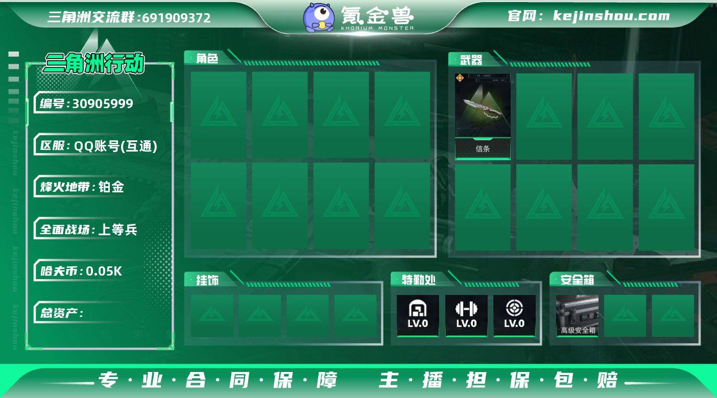 总资产:119M 1近战传说 7传说枪械 高级安全箱(2*3)1.28号到期 哈夫币:54.463K 可二次 不可修改实名 【烽火地带段位】:铂金 【全面战场段位】:上等兵 【传说武器皮肤】:近战-信条,AS Val突击步枪-悬赏令(典藏),KC17突击步枪-电锯惊魂,P90冲锋枪-信条,SR-25射手步枪-信条,SG552突击步枪-运动员,SCAR-H战斗步枪-启航 【史诗武器皮肤】:M250通用机枪-寒冬猎手,SG552突击步枪-哈夫克警备,勇士冲锋枪-工业狂潮,MP5冲锋枪-战术竞备,G3战斗步枪-流沙送葬,M249轻机枪-异域战争,M700狙击步枪-百步穿杨,Vector冲锋枪-百步穿杨,Vector冲锋枪-猎鳄行动,MP5冲锋枪-深海恐惧