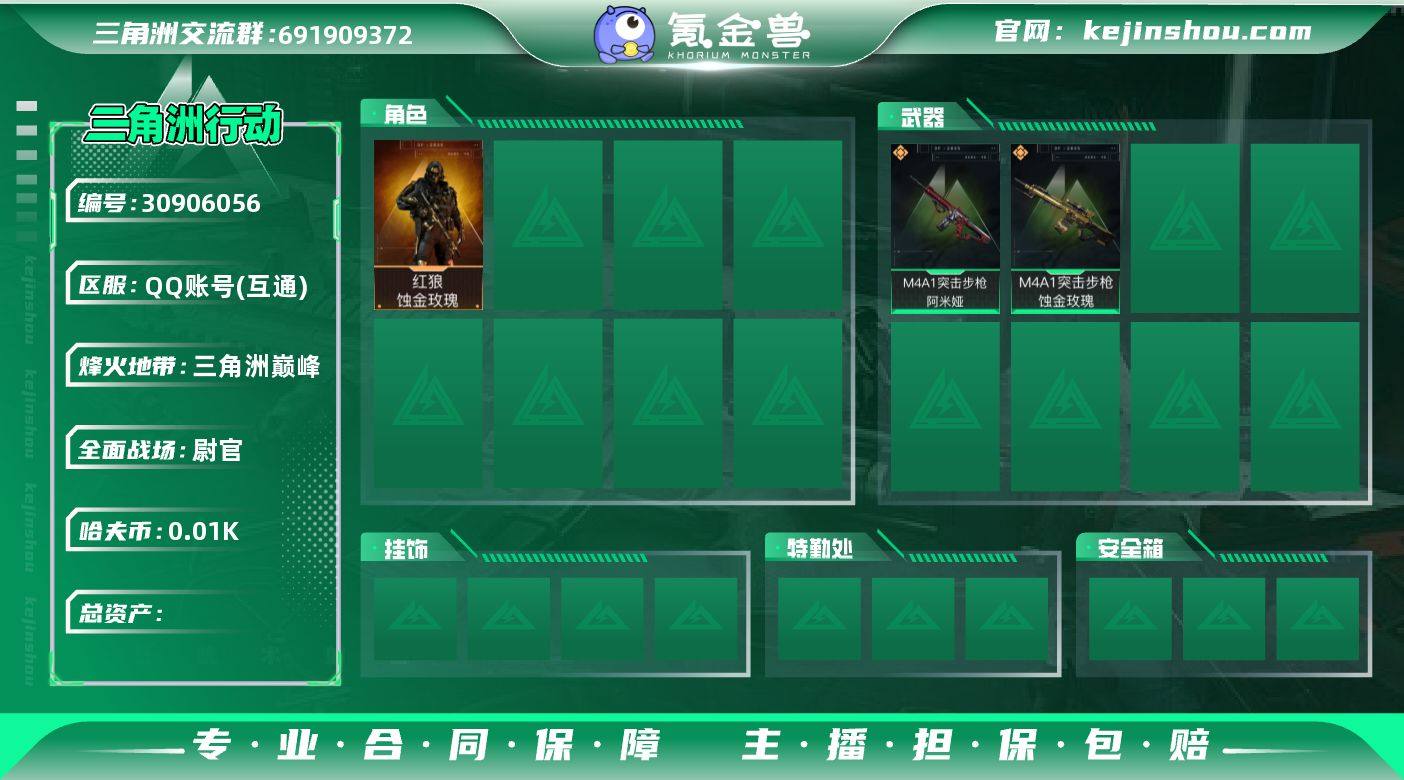总资产:94.8M 4干员外观 12传说枪械 顶级安全箱(3*3)1.28号到期 哈夫币:12.909K 不可修改实名 【烽火地带段位】:三角洲巅峰 【全面战场段位】:尉官 【干员外观】:骇爪-维什戴尔,红狼-蚀金玫瑰,红狼-电锯惊魂,露娜-金牌射手(S7) 【传说武器皮肤】:M4A1突击步枪-阿米娅,G3战斗步枪-骑士,KC17突击步枪-电锯惊魂,SG552突击步枪-运动员,勇士冲锋枪-能天使-午夜邮差,QJB201轻机枪-鹅鸭杀,M250通用机枪-骑士之心,R93狙击步枪-维什戴尔,SCAR-H战斗步枪-启航,ASh-12战斗步枪-鹅鸭杀,QCQ171冲锋枪-鹅鸭杀,M4A1突击步枪-蚀金玫瑰