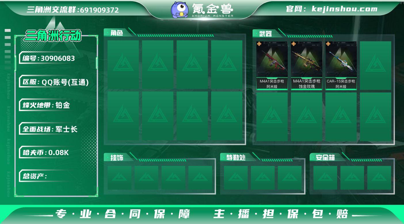 总资产:183.4M 1干员外观 9传说枪械 哈夫币:85.295K 可二次 可修改实名 【烽火地带段位】:铂金 【全面战场段位】:军士长 【干员外观】:红狼-电锯惊魂 【传说武器皮肤】:CAR-15突击步枪-阿米娅,M4A1突击步枪-阿米娅,KC17突击步枪-电锯惊魂,QJB201轻机枪-鹅鸭杀,QCQ171冲锋枪-鹅鸭杀,ASh-12战斗步枪-鹅鸭杀,R93狙击步枪-维什戴尔,SCAR-H战斗步枪-启航,M4A1突击步枪-蚀金玫瑰 【史诗武器皮肤】:AUG突击步枪-蝮蛇,M250通用机枪-寒冬猎手,M250通用机枪-囚徒,腾龙突击步枪-猎鳄行动,MP5冲锋枪-深海恐惧