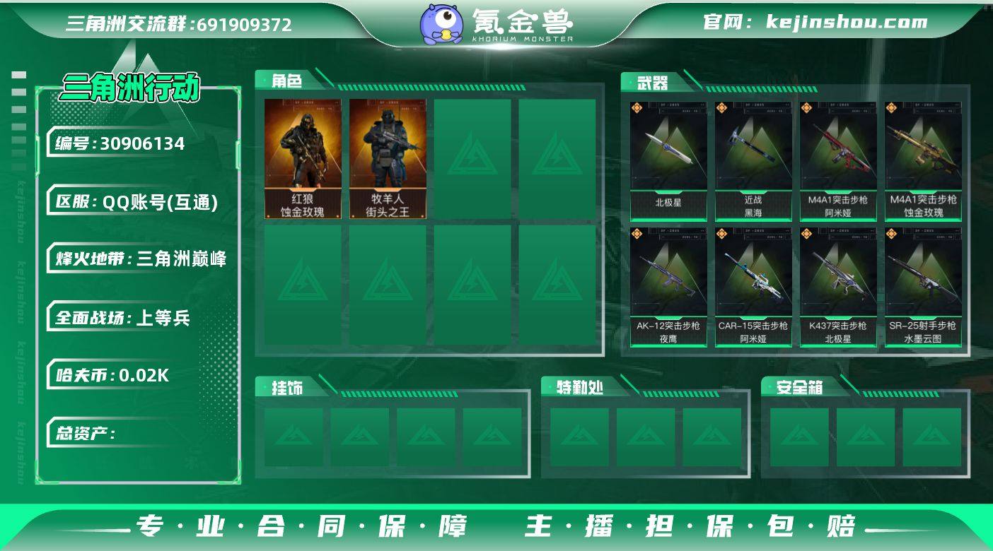 总资产:251M 3干员外观 2近战传说 31传说枪械 哈夫币:22.753K 可二次 可修改实名 【烽火地带段位】:三角洲巅峰 【全面战场段位】:上等兵 【干员外观】:红狼-蚀金玫瑰,蜂医-送葬人·无题密令(S5),牧羊人-街头之王(S2) 【传说武器皮肤】:近战-黑海,近战-北极星,M7战斗步枪-棱镜攻势S2(典藏),SR-25射手步枪-水墨云图,K437突击步枪-北极星,M16A4突击步枪-狩猎时刻,G3战斗步枪-狩猎时刻,Vector冲锋枪-狩猎时刻,CAR-15突击步枪-阿米娅,M4A1突击步枪-阿米娅,725双管霰弹枪-送葬人-无题密令,QCQ171冲锋枪-北极星,KC17突击步枪-电锯惊魂,腾龙突击步枪-死神玫瑰,QJB201轻机枪-鹅鸭杀,AS Val突击步枪-死神玫瑰,S12K霰弹枪-死神玫瑰,SG552突击步枪-运动员,QCQ171冲锋枪-鹅鸭杀,AK-12突击步枪-特斯拉线圈,SR-3M紧凑突击步枪-特斯拉线圈,UZI冲锋枪-特斯拉线圈,勇士冲锋枪-能天使-午夜邮差,ASh-12战斗步枪-鹅鸭杀,M250通用机枪-骑士之心,R93狙击步枪-维什戴尔,SCAR-H战斗步枪-启航,M7战斗步枪-维京,M4A1突击步枪-蚀金玫瑰,AK-12突击步枪-夜鹰,SMG45冲锋枪-骑士
