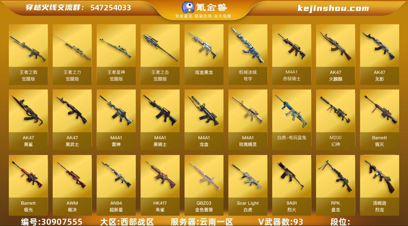 西部战区(云南一区)lb【精美爆破生化号】【两万四千点券】双传说【传说光耀,传说辉光】93v【M200-幻神+双皮/冠军之幻/CFS2022,王者星神,Knife-冠军之刃,QBZ03-金色蔷薇套装+皮/冠军之薇,ScarLight-白虎套装+皮/大汉风骨,AWM-裁决套装+皮/流光秘银,HK417-朱雀,白虎-电玩蓝兔,M14EBR-玄武,荣耀世冠-火麒麟,荣耀世冠-雷神,6盘龙+6烈龙+6炼狱+斯泰尔-蝴蝶,USP-雷暴,荣耀世冠-柯尔特,金刚伞-电玩红兔,Colt1911-小故障】5王者【王者星神,王者之戮,王者之力,王者之击】1炫金【炫金黑龙】9角色【四防王者葵-惊若翩鸿,四防王者沙漠玫瑰,四防王者-迷迭香,王者凌霄,审判者,鹰,战地猎狐,王者-救世主,葵-赛博朋克,零-热舞青春,灵动武士,职业选手】8音效【ScarLight-白虎音效卡,QBZ03-金色蔷薇音效卡,AWM-裁决音效卡,M4A1-黑骑士音效卡,AK47-火麒麟音效卡,Barrett-碧霄极光音效卡,AWM-昌龙-怀旧音效卡,Barrett-毁灭音效卡】43皮【幻神-冠军之幻,幻神-CFS2022,黑骑士-少林,雷神-荣耀世冠AG,裁决-流光秘银,白虎-大汉风骨,QBZ03-冠军之薇,毁灭-星空,烈龙-星空,雷神-宠儿,火麒麟-心动糖果,修罗-CFS2018,黑骑士-冠军之势,毁灭-冠军之怒,无影-霓棠,火麒麟-CF STAR,天龙-CF STAR,黑武士-361,雷神-冠军之魄,雷神-虎将,毁灭-荣耀之怒,火麒麟-华夏之心,火麒麟-AG战队,修罗-CF STAR,黑武士-典韦】VIP3、 截图展示段位不代表实际段位 如赛季更新等不可抗拒因素发生变化、时限道具不保证所剩时间