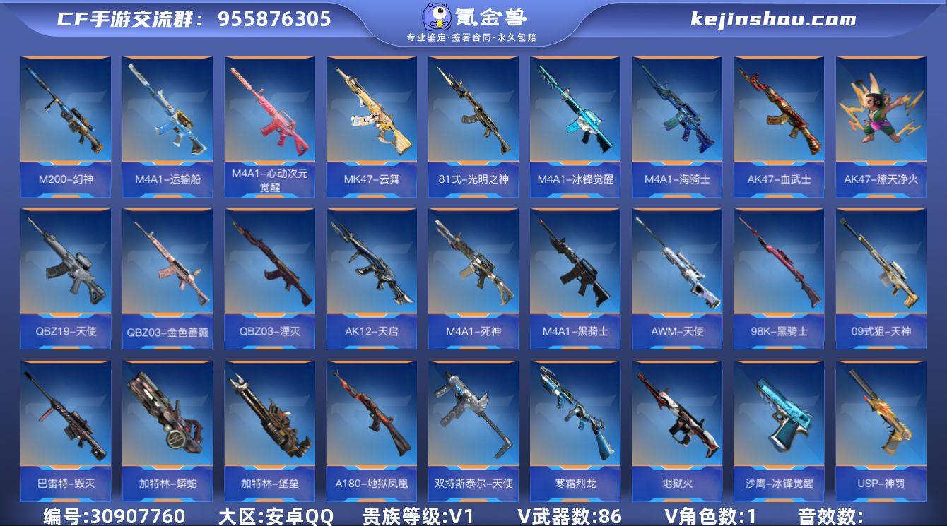 【QZF41】VIP1/86V/王者之心/王者之魂/王者之霆/81式-光明之神/M200-幻神/萝拉-X/AK47-燎天净火/AK47-血武士/AK47-木兰/M4A1-黑骑士/M4A1-死神/M4A1-海骑士/M4A1-冰锋觉醒/M4A1-心动次元觉醒/M4A1-运输船/AK12-天启/QBZ03-湮灭/QBZ03-金色蔷薇/HK417-炎龙铠甲/QBZ19-天使/MK47-云舞/QBZ191-封神榜/AWM-天使/AWM-大湾溢彩/巴雷特-毁灭/09式狙-天神/98K-黑骑士/98K-星神/TAC-晴舞/加特林-堡垒/加特林-蟒蛇/寒霜烈龙/双持斯泰尔-天使/A180-地狱凤凰/地狱火/KSG-钟馗觉醒/M1887-幽冥玄喵觉醒/USP-神罚/沙鹰-修罗/沙鹰-冰锋觉醒/改装GLOCK-木兰/GLOCK18-猎神/炽芒蝶刃/神罚战斧/手斧-机械迷城/屠龙/麒麟刺/马来剑-毁灭/唐刀-大唐荣耀/末日裁决觉醒
