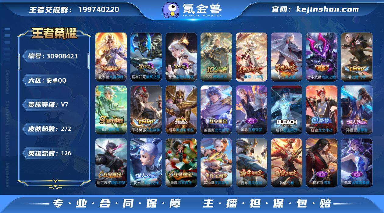 AHC30605 安卓Q-V7-最强王者段位-126英雄-272皮肤-1典藏皮肤-8传说-66史诗 【英雄全皮】:狂铁全皮 【荣耀典藏】:花木兰九霄神辉 【传说皮肤】:后羿神树通天,澜愿照九州拓,桑启鸣野蒿,曜云鹰飞将,干将莫邪久胜战神,后羿黄金射手座,李白凤求凰,宫本武藏地狱之眼 【限定皮肤】:蒙犽顽岩魄,蔡文姬夏日便利店,大乔绒语心约,虞姬夏日便利店,姜子牙天穹之誓,狄仁杰阴阳师,赵云皇家上将,阿轲迷踪丽影,芈月重明,吕布御风骁将,周瑜赤莲之焰,元歌云间偶戏,夏侯惇朔风刀,曹操烛龙,典韦穷奇,马可波罗暗影游猎,狄仁杰魔术师,狄仁杰万华元夜,项羽海滩派对,老夫子醍醐杖,程咬金演武夺筹,刘邦夺宝奇兵,韩信飞衡,兰陵王驯魔猎人,兰陵王金庭之子,花木兰默契交锋,亚瑟潮玩骑士王,孙悟空至尊宝,牛魔御旌,李元芳银河之约,钟馗驱傩正仪,蔡文姬繁星吟游,太乙真人饕餮,鬼谷子原初探秘者,鬼谷子五谷丰年,百里玄策原初追逐者,弈星混沌棋,沈梦溪星空之诺,明世隐疑决卦,裴擒虎李小龙,裴擒虎擒涛扼浪,狂铁御狮,狂铁电玩高手,米莱狄御霄,云中君纤云弄巧,盾山御銮,猪八戒西部大镖客,上官婉儿梁祝,嫦娥拒霜思,西施玲珑珍味,鲁班大师探海日志,桑启海盐诗旅,戈娅驭风魔法,艾琳女武神,艾琳流音漫舞,阿古朵江河有灵,张良古海寻踪,蒙犽百解令,蒙恬荣光圣徽,高渐离燃音魔法,妲己灵卜魔法,鬼谷子天穹祈灯,姬小满妄想食味,鲁班七号蔬乡物语,李元芳蔬乡物语,刘邦剑破天穹,上官婉儿群星魔术团,程咬金群星魔术团,镜青焰无极,项羽苍威无极,刘备异域游侠,周瑜熔金海岸 【年限皮肤】:李白凤求凰,韩信飞衡,吕布御风骁将,澜愿照九州拓 【赛季限定】:太乙真人饕餮,曹操烛龙,芈月重明,典韦穷奇,狂铁御狮,米莱狄御霄,牛魔御旌,盾山御銮,夏侯惇朔风刀,弈星混沌棋,明...
