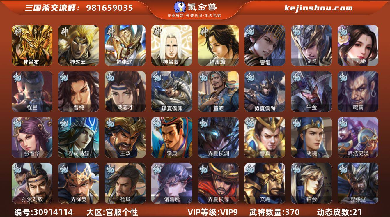 VIP等级: VIP12 官阶: 大将军 武将数量: 407 动态皮肤数量: 45 神将: 神甘宁,神郭嘉,神陆逊,神吕布,神孙策,神赵云,神关羽,神吕蒙,神周瑜,神诸葛亮 魏国武将: 戏志才,曹纯,曹婴,陈琳,程昱,郝昭,嵇康,界于禁,界钟会,王元姬,文鸯,杨修,王粲,唐咨-魏,张辽,SP蔡文姬,SP曹仁,SP关羽,SP贾诩,SP姜维,SP庞德,卞夫人,蔡贞姬,曹昂,曹操,曹冲,曹洪,曹丕,曹仁,曹叡,王异,张恭,鲁芝,界满宠,曹休,界曹植,满宠,荀攸,王基,钟繇,蒯越蒯良,郭嘉,荀彧,阮慧,杜畿,界郭嘉,崔琰,界曹丕,界荀彧,朱灵,界甄姬,吕虔,界王异,界许褚,界郭淮,华歆,陈群,界邓艾,界典韦,袁涣,李通,乐进,辛宪英,郭淮,界曹彰,郭皇后,毌丘俭,夏侯惇,曹植,司马朗,谋于禁,界曹操,许褚,界张辽,张郃,钟会,文聘,曹彰,界夏侯惇,诸葛诞,司马懿,甄姬,杨阜,界徐晃,徐晃,界曹仁,孙资刘放,韩浩史涣,胡班,曹真,典韦,界夏侯渊,夏侯渊,李典,于禁,王双,邓艾,界司马懿,张春华,孟达-魏,臧霸,牛金,朱灵(国战),谋郭嘉 蜀国武将: 花鬘,傅佥,沙摩柯,王平,张星彩,周群,诸葛瞻,谋马超,谋黄忠,马云騄,徐庶,界魏延,杨仪,吕凯,界关羽,界诸葛亮,邓芝,界伊籍,费祎,严颜,界黄月英,界张嶷,赵云,张松,彭羕,李丰,界刘备,界刘禅,谋姜维,刘封,糜竺,谋庞统,黄月英,刘巴,关羽,王甫赵累,吴懿,吴班,界廖化,祝融,张飞,黄皓,陈震,魏延,界周仓,马忠,界法正,糜夫人,界孟获,刘禅,界赵云,界姜维,张翼,关银屏,界祝融,SP孙尚香,SP徐庶,卧龙诸葛,宗预,周仓,简雍,谋孟获,界关兴张苞,诸葛亮,孙乾,界张飞,界卧龙诸葛,法正,界简雍,赵统赵广,陈到,界马岱,关平,马岱,界庞统,庞统,诸葛果,谋张飞,马谡,马超,廖化,关兴张苞,孟获,秦宓,吴苋,夏侯氏,姜维,黄忠,刘备,界马超,李严,马良,傅肜,蒋琬费祎,许靖,刘谌,彭羕(国战),甘夫人 吴国武将: 界徐盛,界朱然,留赞,孙寒华,孙皓,文鸯,潘濬,周泰,全琮,吕蒙,SP庞统,诸葛恪,界孙尚香,界顾雍...