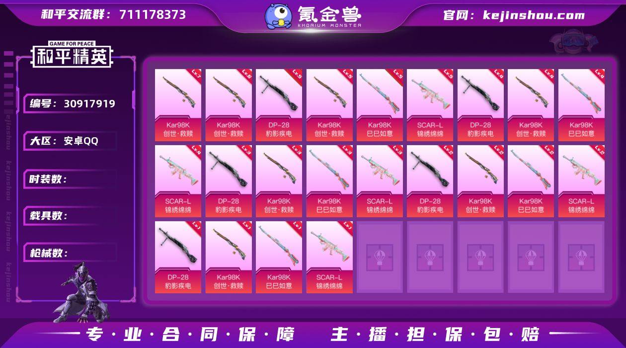 无二次-安卓 手Q-1粉装-6特效枪-0载具-2粉色飞行器-51221热力值-15王牌印记-151套装-178枪皮 【热门品类】:角色-2P战斗服款,套装-龟仙人,套装-暗影哥特 【粉色套装】:角色-羊梦糖心 【粉色枪皮等级】:ACE32-萌骑漫游(五级),Kar98K-巳巳如意(五级),Mk14-福马献瑞(五级),DP-28-圣堂之誓(七级),DP-28-豹影疾电(五级),MG-36-沧焰双生(五级) 【粉色枪皮】:ACE32-萌骑漫游,Kar98K-巳巳如意,Mk14-福马献瑞,DP-28-圣堂之誓,DP-28-豹影疾电,MG-36-沧焰双生 【粉色飞行器】:炫彩糖果飞行器,极意拳锋飞行器 【粉色降落伞】:炙焰牛王降落伞,垂柳戏鸭降落伞,太空嘟嘟降落伞,繁龙极客降落伞,幻彩电音降落伞,绯穹魔姬降落伞,异瞳寒姬降落伞 【稀有套装】:套装-龟仙人,套装-巳巳如意,套装-雪国风尚,套装-马上有钱,角色-多纳泰罗,套装-极速光影,套装-朱霞炽焰,套装-凌霄紫焰,套装-擎苍青焰,玩偶服-懒羊羊,套装-红釉青花,角色-唐三 【稀有枪皮】:AKM-夜灯,AKM-彩虹符号,AKM-破晓战魂,AKM-虎虎生威,AKM-龙的传人,M16A4-幻世战舞者,M16A4-红色方程式,M16A4-蓝色火焰,SCAR-L-炫彩节奏,SCAR-L-玉兔迎春,SCAR-L-红色方程式,M416-糯团青竹,M416-红色方程式,M416-绯红前夜,M416-蓝色火焰,GROZA-彩虹符号,GROZA-影袭,GROZA-懵萌河马,AUG-2P战斗服款,AUG-天降萌叽,AUG-耀粉歌者,M762-天降萌叽,M762-绯红前夜,M762-墨金战记,Mk47-妙红点点,G36C-懵萌河马,AC-VAL-天降萌叽,AC-VAL-快闪甜心,蜜獾-垂柳戏鸭,蜜獾-天降萌叽,蜜獾-娇憨猪猪,ARX-凌霄紫焰,UZI-天降萌叽,UZI-娇憨猪猪,UZI-影袭,UZI-红色方程式,UMP45-夜灯,UMP45-生命誓言,UMP45-蓝色火焰,Vector-焰鹰斗篷,Vector-生命誓言,Vector-音爆索尼克,汤姆逊-天降萌叽,汤姆逊-炫彩节奏,汤姆逊-耀粉歌者,AKS...