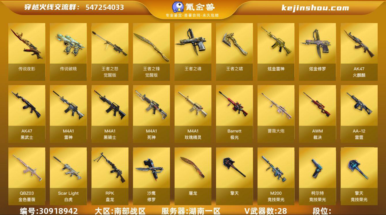 实名: 可修改 排位资格: 有 V武器: AK47-火麒麟,AK47-黑武士,M4A1-雷神,M4A1-黑骑士,M4A1-死神,M4A1-玫瑰精灵,Barrett-极光,蔷薇大炮,AWM-裁决,AA-12-雷霆,QBZ03-金色蔷薇,Scar Light-白虎,RPK-盘龙,沙鹰-修罗,屠龙,擎天,M200-竞技荣光,柯尔特-竞技荣光,擎天-竞技荣光,裁决,盘龙,传说夜影,传说破晓 王者武器: 王者之魂,王者之啸,王者之锋-觉醒版,王者之怒-觉醒版 炫金武器: 炫金雷神,炫金修罗 狙击枪稀有皮肤: 幻神-AG-CFPLS17冠军 英雄角色: 鹰,关小雨,兰-海滩派对,王者潘多拉 音效道具: M4A1-雷神音效卡,M4A1-黑骑士音效卡,QBZ音效卡,金色蔷薇音效卡,朱雀音效卡