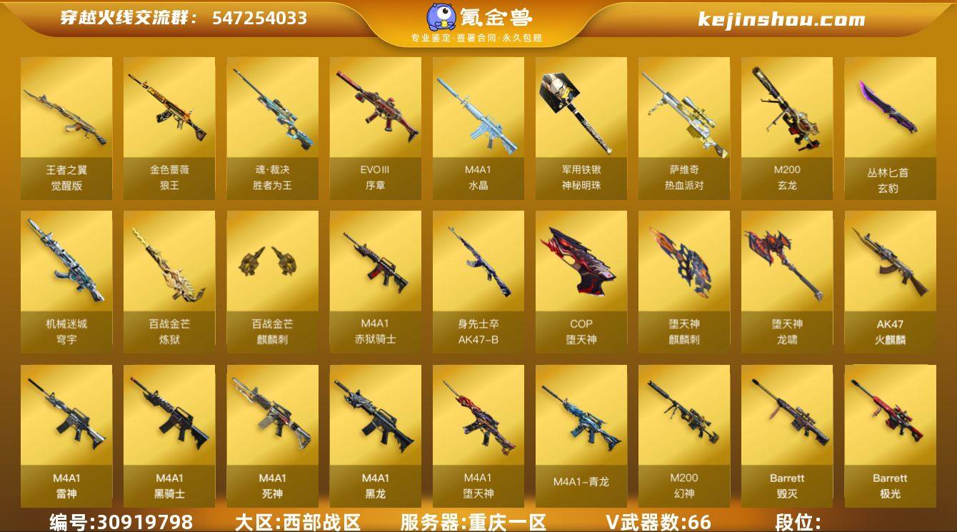 四川一区-30V-1王者武器数-1炫金武器数 【传说角色】:传说女帝 【热门武器】:Scar Light-白虎,HK417-朱雀,白虎-电玩蓝兔,M4A1-黑骑士*2,加特林-炼狱 【王者炫金武器】:王者云击,炫金修罗 【音效卡】:M4A1-黑骑士音效卡,Barrett-毁灭音效卡,Scar Light-白虎音效卡,Barrett-碧霄极光音效卡 【皮肤】:裁决-羽掣 皮肤,雷神-暗月,雷神-机甲刑天皮肤,雷神-化蛇 皮肤,火麒麟-雷神,火麒麟-平天大圣,火麒麟-心动糖果,毁灭-暗月,毁灭-黑大圣皮肤,毁灭-魔灵皮肤,M4A1-千变-孔明皮肤,黑骑士-暗月*2,战神-紫绶金章皮肤,AK47-B-常胜将军-曹操,炼狱-玩具枪皮肤,龙啸-青青莓果 皮肤 【角色】:鹰,零·纪元,战地猎狐,乔伊教练,暗夜-X,北极狐-X,初恋灵狐,芳心审判者,风暴女,嘉年华灵狐,兰-海滩派对,灵狐者-七夕宝贝,龙儿-小淘气,曼陀罗-X,曼陀罗-礼服,青霞仙子,蛇姬,斯沃特-X,蜀雪,铁骑荣耀,兔囡囡,樱-战斗天使 【人偶武器】:街机小灰机,AWM-灵狐-15周年嘉年华,海滩汪汪-巴雷特,迷你深渊冰龙*2,迷你裂空之翼*4,迷你牛魔王,迷你波特博士*7,迷你曼提柯尔,夺魂,迷你牛牛*3,迷你火种*5,深渊终结者手雷,迷你艾比,迷你巨石泰坦-魔花研究所 【暴走生化】:异变清道夫,双面神,超级对讲机 【挑战大师】:冰龙粉碎者-白马银枪,VEPR-12-金魔,机甲撕裂者III*2,试炼破坏者III,KAC-圣炎切割者III,神圣爆裂者-末日III,惩戒者III,VEPR-12-紫魔,VEPR-12-红魔 【英雄级武器】:AK47-火麒麟*2,M4A1-雷神,M4A1-黑骑士*2,AK12-天启,AN94-超新星,HK417-朱雀,Scar Light-白虎,无影-神兵利器,烈火-动感闪耀,AK-47-猩红传说,AK47-B-常胜将军,白虎-电玩蓝兔,机械迷城-穹宇,Barrett-毁灭,AWM-裁决,加特林-炼狱,沙鹰-天神,天神-动感闪耀,屠龙,龙啸,麒麟刺,屠龙-动...