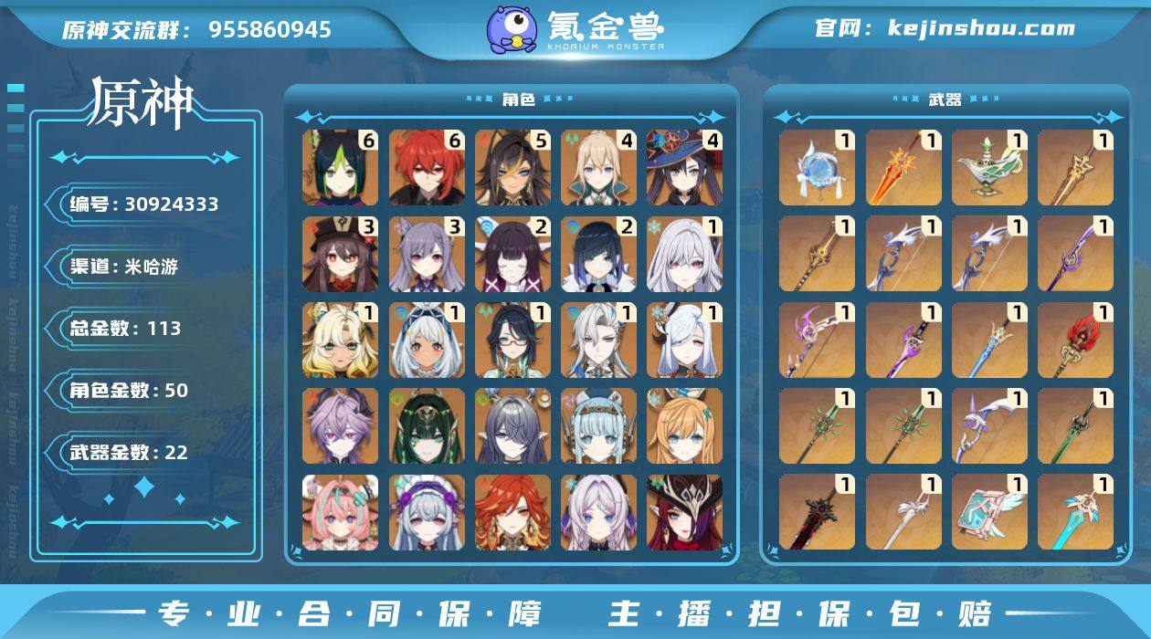 冒险等级:60 总黄数:113 男/女主:女主 5星角色数:50 5星武器数:22 纠缠之源数量:3 原石数量:715 卖家说:少女2+1 除少女外角色全满好感度 版本满成就 大地图宝箱神瞳摩拉箱全收集大世界无资源 女角色差可莉男角色差几个 五星角色均高练度大毕业面板 三个深渊无压力(幽静过n5)