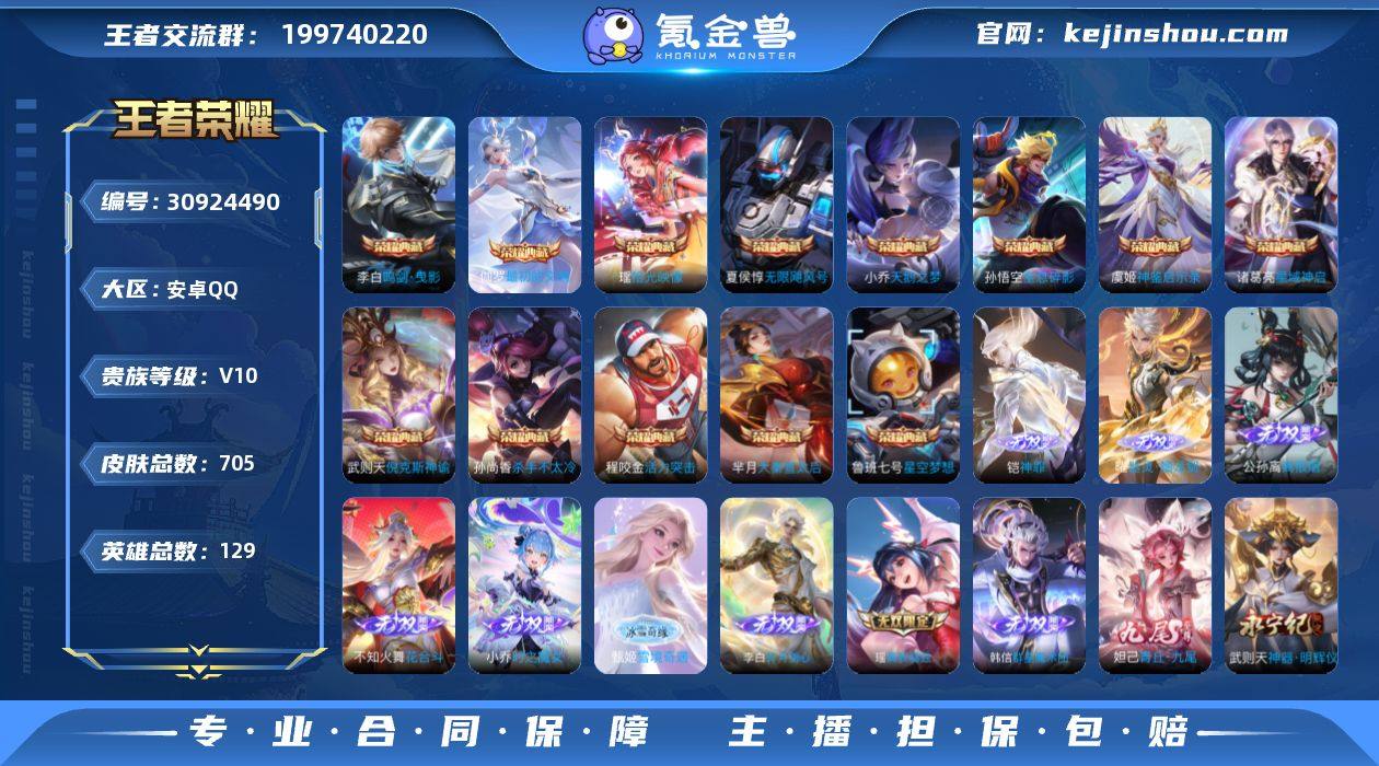 实名: 可修改 贵族等级: V10 英雄数: 129 皮肤数: 705 荣耀水晶: 武则天,天鹅之梦,星空梦想,倪克斯神谕,无限飓风号,活力突击,杀手不太冷,大秦宣太后,鸣剑·曳影,全息碎影,星域神启,神鉴启示录,拾光映像,最初的交响 无双皮: 真我赫兹(瑶),神器·明辉仪,青丘·九尾,碎月剑心,小乔时之魔女,韩信群星魔术团,花合斗,离恨烟,雪境奇遇-甄姬,器灵·螭龙剑,神罪 珍品传说: 怪盗基德,时之奇旅-孙策,器灵·落星盏 传说皮: 黄金狮子座,黄金射手座,冠军飞将,云鹰飞将,绛天战甲,黄金白羊座,猫影幻舞,久胜战神,炽阳神光,一念神魔,云霓雀翎,末日机甲-孙尚香,地狱火,仲夏夜之梦,音你心动-小乔,零号·赤焰,海洋之心,地狱之眼,飞鸢探春,音你心动-周瑜,胖达荣荣,李逍遥,乞巧织情,时之恋人-刘备,游龙清影,淬星耀世,超时空战士-狄仁杰,遇见胡旋,末日机甲-孙策,花朝如约,挚爱之约,挚爱花嫁,无双飞将,音你闪耀,碎云,神器·狴犴令,神器·明辉仪,山海·炽霜斩,山海·琳琅生,山海·苍雷引,炽翼辉光,燃星之曲,画中仙,浮生妄,记忆之芯,百相守梦(张飞),追逃游戏(亚瑟),追逃游戏(安琪拉),电玩·雷克斯,鹤羽星尊,灼幽烈阳,妄想实况,妄想奇谈,鹤归松栖(云缨),惊梅引,遇见神鼓,鲁班七号-时之奇旅,大乔-时之奇旅,永恒水手月亮,夜礼服假面,小动物乐团,霜月吟,澜逐花归海,艾琳觅芳踪,琥珀纪元铠,琥珀纪元马超,乘龙·问璇玑,乘龙·铭钟鼎,乘龙·淬吴钩,貂蝉曦玄引,吕布曦玄引,典韦战鼓燎原,落雪白狼,金乌负日,黄金天蝎座,云中君群星魔术团,朵莉亚心动手记,铠冥王哈迪斯,牧神诗旅,启明星使,玄雷天君,幻光神枪,祥瑞亨通,星之鸣奏,千劫归真,续相思,云诺千山,万灵伏威,神树通天,纵目迁山 限定皮: 冰锋战神,遇见飞天,李小龙,奔雷神使,祈雪灵祝,游园惊梦,梁祝,御风骁将,云端筑梦师,时雨天司,引擎之心,龙胆,白鹤梁神女,武圣,烈魂,魔法小厨娘,辉光之辰,异界灵契-孙尚香,玄嵩,白晶...