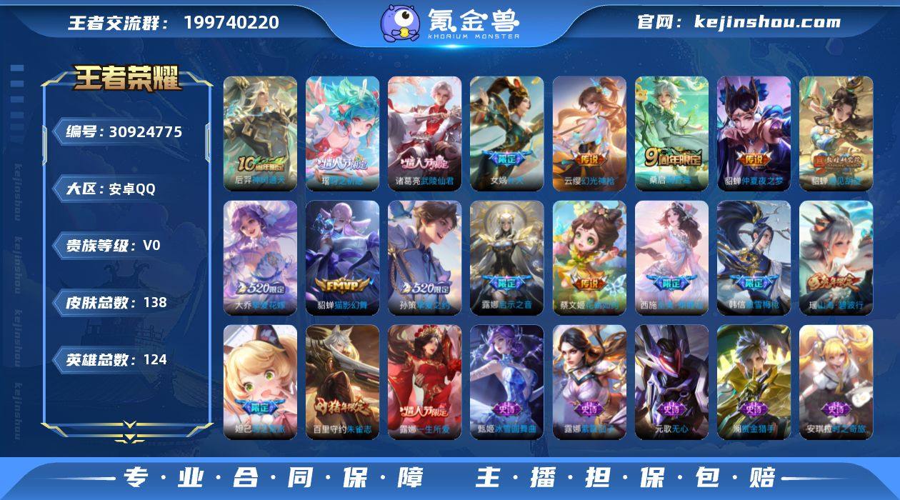 贵族等级:V0 典藏皮肤数:0 珍品无双皮肤数:0 无双皮肤数:0 珍品传说皮肤数:0 传说皮肤数:13 史诗皮肤数:35 皮肤数:138 英雄数:124 段位:铂金 卖家说:有13款传说限定,瑶时之祈愿 诸葛亮武陵仙君,大乔孙策情人节,貂蝉有3个,2个传说,1个限定,露娜限定,女娲限定