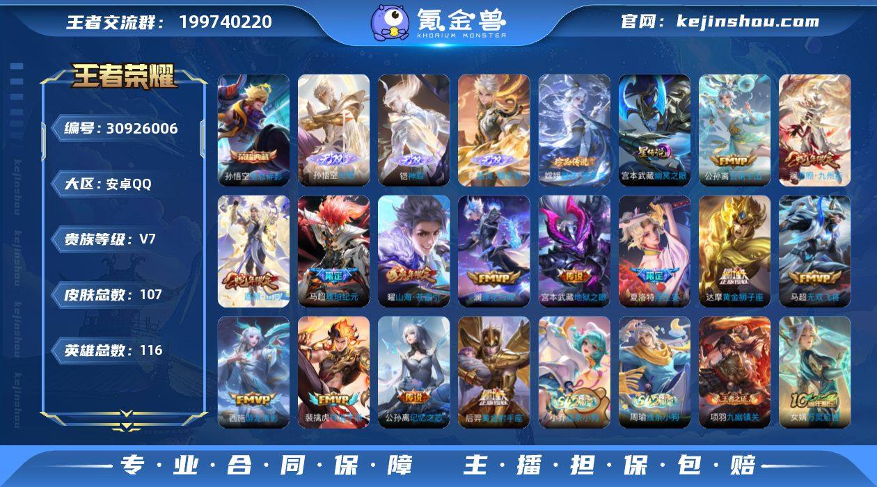 贵族等级:V7 典藏皮肤数:1 珍品无双皮肤数:0 无双皮肤数:3 珍品传说皮肤数:1 传说皮肤数:14 史诗皮肤数:34 皮肤数:107 英雄数:116 段位:星耀 卖家说:有点急