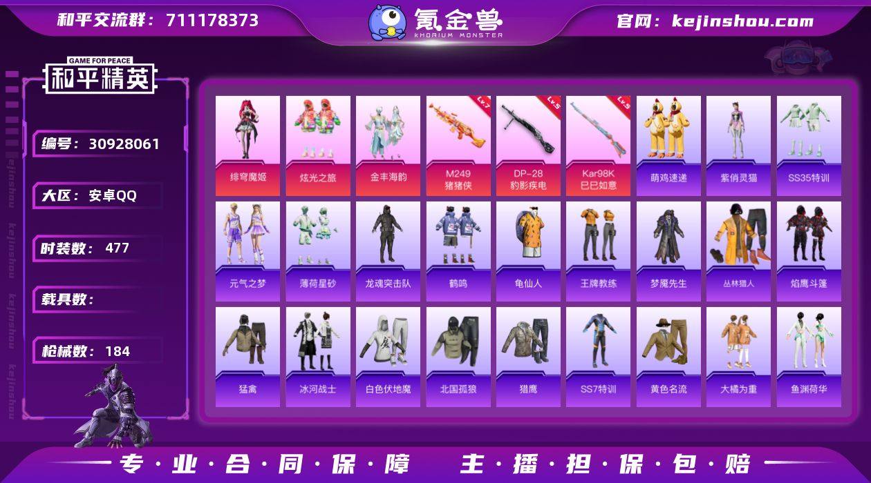 热力值:51662 时装数:477 枪械数:184 战备数:109 游戏等级:61 卓越印记:0 传奇印记:0 绝世印记:0 绯穹魔姬,金丰海韵,炫光之旅 七级M249-猪猪侠,五级DP-28-豹影疾电,五级Kar98K-巳巳如意 炫彩糖果降落伞,异瞳寒姬降落伞,彩虹甜喵降落伞,恐龙拽拽降落伞,千金淑猫降落伞,守护天翼降落伞,星穹咏叹调降落伞,音爆索尼克降落伞,仲夏莫吉托降落伞 萌鸡速递,紫俏灵猫,SS35特训,元气之梦,薄荷星砂,冰川特警,缤纷果语,北国孤狼,冰河战士,白色伏地魔,春光漫游,长空猛禽,丛林猎人,传奇侦探,炽焰拳师,纯真浪花,大橘大利,大橘为重,蝶吟花词,疯狂小兔子,粉甜马卡龙,福星高照,格斗专家,龟仙人,幻彩翩翩,海岛探路者,鹤鸣,湖蓝色名流,海琴烟,黑色刀锋,黑色伏地魔,黄色名流,黄色运动,红色运动,幻世战舞者,幻羽潜行,惊鸿侠骨,橘黑制服,娇憨猪猪,竞技名士,竞技勇士朋克,吉莉礼服,精神漫游,锦衣飞扬,空岛之星,狂花道·雅典娜,快闪甜心,蓝冰羽,蓝彩潮人,蓝调潮人,龙的传人,龙魂突击队,猎鹰,龙舌兰冰茶,蓝色运动,恋语绒绒,Mark.06,猛禽,妙红点点,梦幻奶油,魅力单车,麻辣教官,懵萌河马,萌趣咩咩,梦域神使,梦魇先生,逆风勇士,霓虹街区,霓虹热舞,柠萌假日,牛气冲天,牛气满满,破蛋小黄鸡,拳皇97草薙京,青年教官,青团波波,热情海星,燃烧卡路里,神气柴柴,SS12特训,SS17特训,SS18特训,SS19特训,SS20特训,SS21特训,SS22特训,SS23特训,SS24特训,SS25特训,SS26特训,SS27特训,SS30特训套装,SS31特训套装,SS32特训套装,SS33特训套装,SS6特训,SS7特训,巳巳如意,特殊使命,糖糖葫芦,特训学院,王牌教练,星梦畅游,雪山精英,星途旅人,核芯基因,星影赞美诗,原初圣火,耀粉歌者,荧惑魅影,焰鹰斗篷,鱼渊荷华,燕燕于飞,智谋强哥,紫幽梦,灼焰舞者 ACE32-冰晶雪宝,MK12-乌木金纹,破片手榴弹-拽到爆炸,S12K-霓彩脉冲,燃点复合弓-罪夜之冕,MG-36-薄荷星砂,P90-玩趣呆呆,AA12-G-纯真浪花,AC-VAL-快闪甜心,AC-VAL-天降萌叽,AC-VAL-闲梦青缨,AKM-破晓战魂,AKM-星之信仰,AKM-灼热熔岩,AMR-妙红点点,AUG-天降萌叽,AUG-甜蜜菠萝,AUG-耀粉歌者,AWM-纯真浪花,AWM-飒粉甜心,AWM-焰鹰斗篷,爆炸猎弓-惊鸿侠骨,DBS-第五大道,DBS-焰鹰斗篷,短管霰弹-星穹咏叹调,大砍刀-黄族统领,DP-28-彩虹符号,DP-28-原初圣火,DP-28-焰鹰斗篷,G36C-懵萌河马,G36C-星穹咏叹调,GROZA-春暖花开,GROZA-黑色刀锋,GROZA-懵萌河马,Kar98K-2B战斗服款,Kar98K-彩虹符号,Kar98K-红色方程式,Kar98K-星穹咏叹调,M16A4-冰河战士,M16A4-红色方程式,M16A4-蓝色火焰,M16A4-魔法学院,M200-惊鸿侠骨,M200-乌木金纹,M249-彩虹符号,M249-妙红点点,M249-破晓战魂,M249-拳皇97,M416-红色方程式,M416-蓝色火焰,M416-糯团青竹,M416-夜灯,M417-惊鸿侠骨,M762-牛气冲天,M762-拳皇97,M762-天降萌叽,MG3-惊鸿侠骨,MG3-妙红点点,蜜獾-精灵梦叶罗丽,蜜獾-娇憨猪猪,蜜獾-糖糖葫芦,Mini14-耀粉歌者,Mini14-炫彩节奏,Mini14-香桃花海,Mini14-原初圣